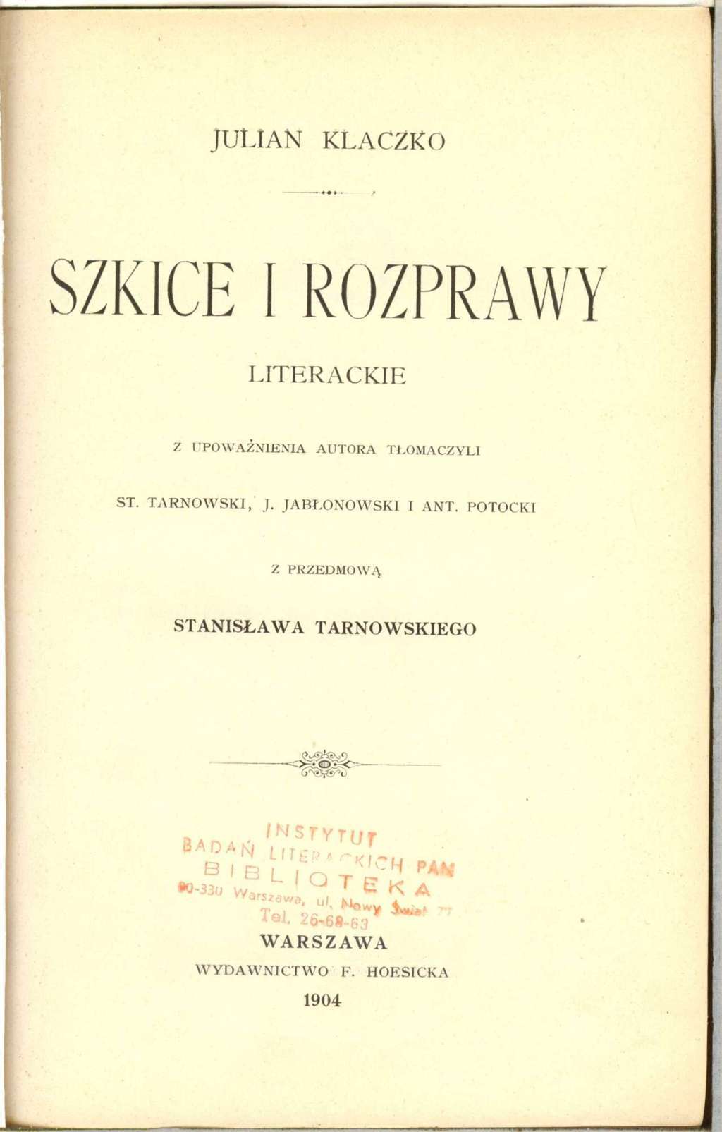 Julian Klaczko, "Szkice i rozprawy literackie" (strona tytułowa), [online] Warszawa: Narodowy Instytut Audiowizualny [dostęp 28.02.2026]. Dostępny w internecie: http://www.ipsb.nina.gov.pl/a/foto/julian-klaczko-szkice-i-rozprawy-literackie-strona-tytulowa
