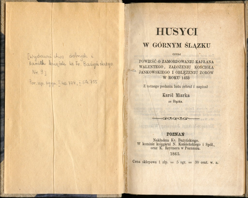 Karol Miarka "Husyci w Górnym Śląsku" (strona tytułowa), [online] Warszawa: Narodowy Instytut Audiowizualny [dostęp 28.02.2026]. Dostępny w internecie: http://www.ipsb.nina.gov.pl/a/foto/karol-miarka-husyci-w-gornym-slasku-strona-tytulowa