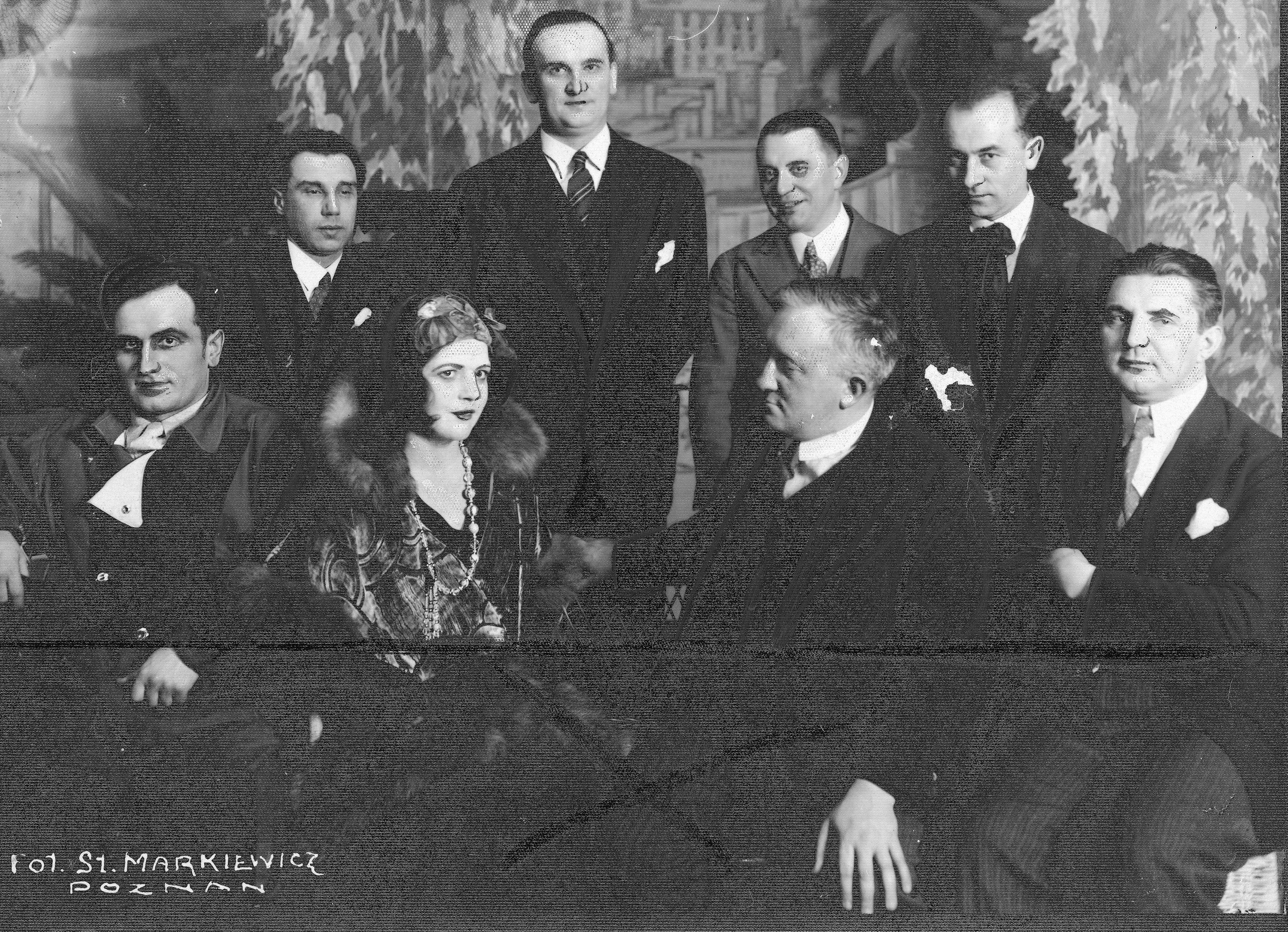 Siedzą od lewej: Stanisław Drabik, Zofia Fedyczkowska, kompozytor Ludomir Rózycki, dyrektor opery i dyrygent Zygmunt Wojciechowski. Stoją od lewej: reżyser Karol Urbanowicz, Eugeniusz Maj, dyrektor Durzyński i scenograf Leon Dołżycki. Fotografia St. Markiewicza.