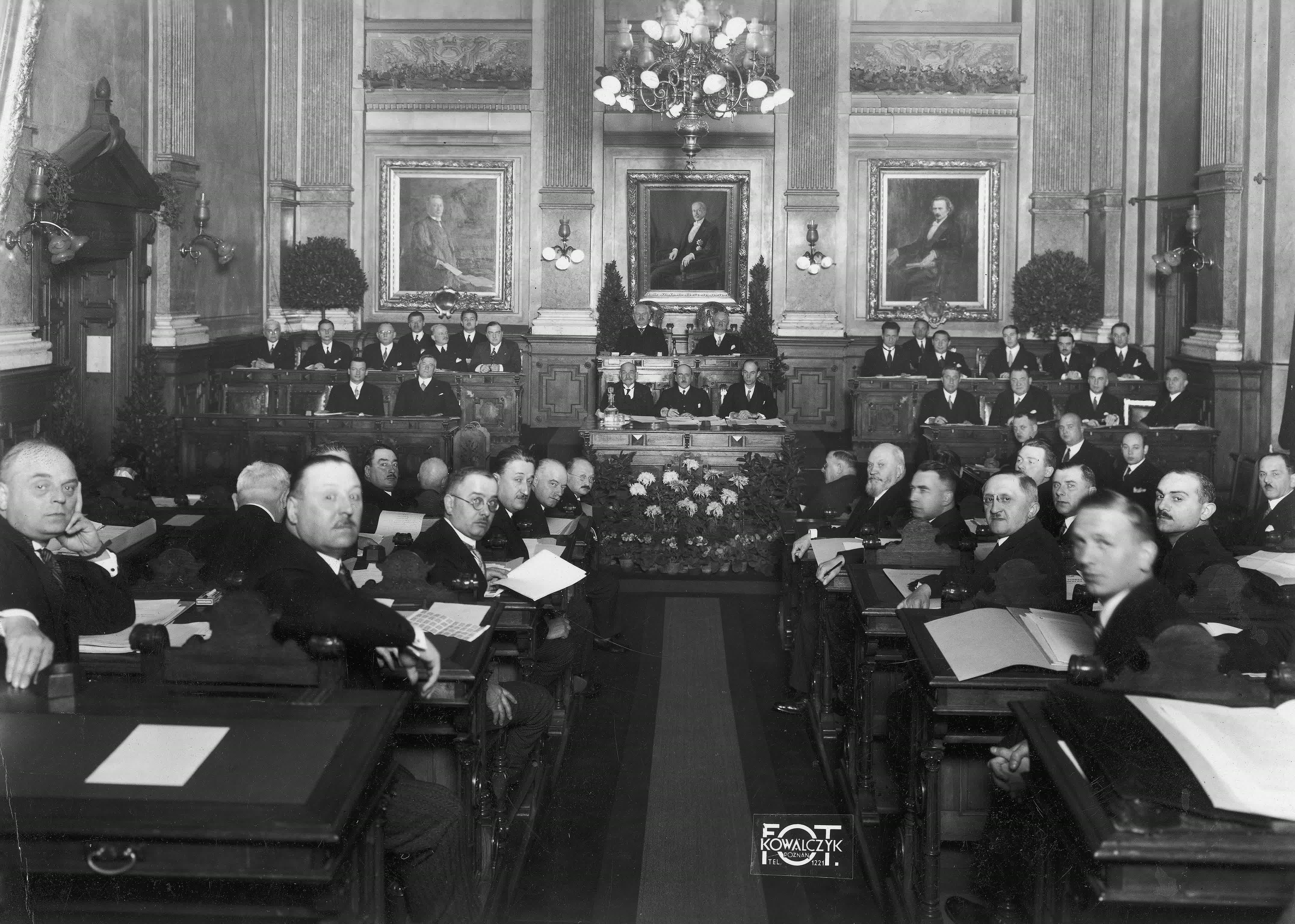 Obrady w sali Rady Miejskiej. Widoczni m.in. za stołem prezydialnym z lewej prezydent Poznania Cyryl Ratajski, wiceprezydent Związku Targów Międzynarodowych dr. Brauer. Przed prezydium widoczni m.in. dr Majnoni, członek Rady Głównej Związku prof. Stefan Ropp (z prawej). Po lewej stronie prezydium, w dolnym rzędzie, z lewej wojewoda poznański Roger Raczyński i wiceminister przemysłu i handlu Franciszek Doleżal. Fotografię wykonał Wł. Kowalczyk.