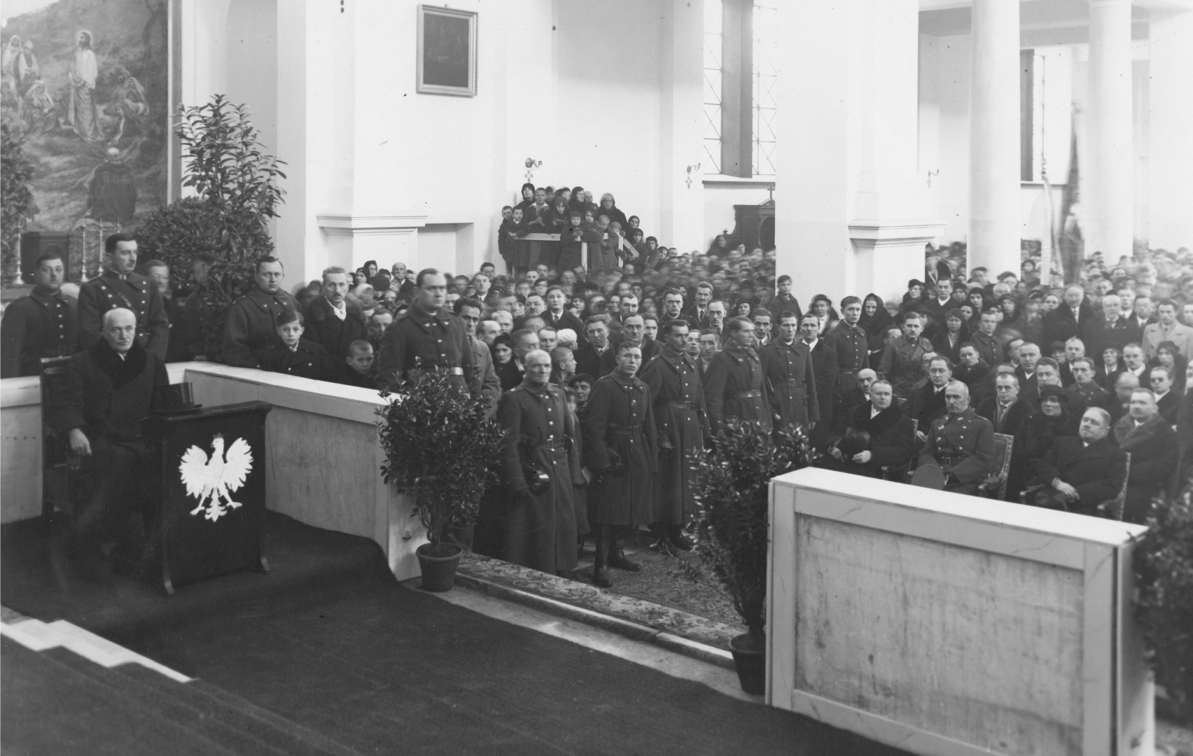 Uczestnicy uroczystości podczas nabożeństwa. Widoczny m.in. prezydent RP Ignacy Mościcki (siedzi z lewej strony przy klęczniku). Za prezydentem stoi jego adiutant porucznik Władysław Krotkiewski. W pierwszym rzędzie przy ołtarzu siedzą od prawej do lewej: prezes Najwyższej Izby Kontroli Jakub Krzemieński, szef Gabinetu Wojskowego Prezydenta RP pułkownik Jan Głogowski, szef Kancelarii Cywilnej Prezydenta RP Bronisław Hełczyński.
