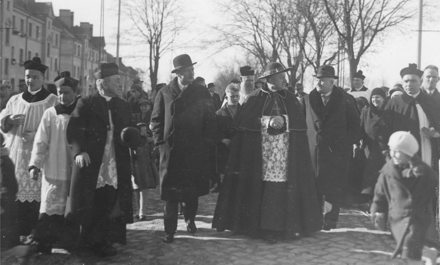 Fragment uroczystości. Widoczni m.in.: ks. kard. prymas August Hlond (w środku, w kapeluszu), ks. kapelan Nikodem Mędlewski (pierwszy z prawej za dziewczynką w jasnym berecie), prezydent Poznania Cyryl Ratajski (na prawo za księdzem prymasem), wojewoda poznański hrabia Roger Raczyński (czwarty z lewej na pierwszym planie), ks. prałat Leon Rankowski (trzeci z lewej na pierwszym planie).