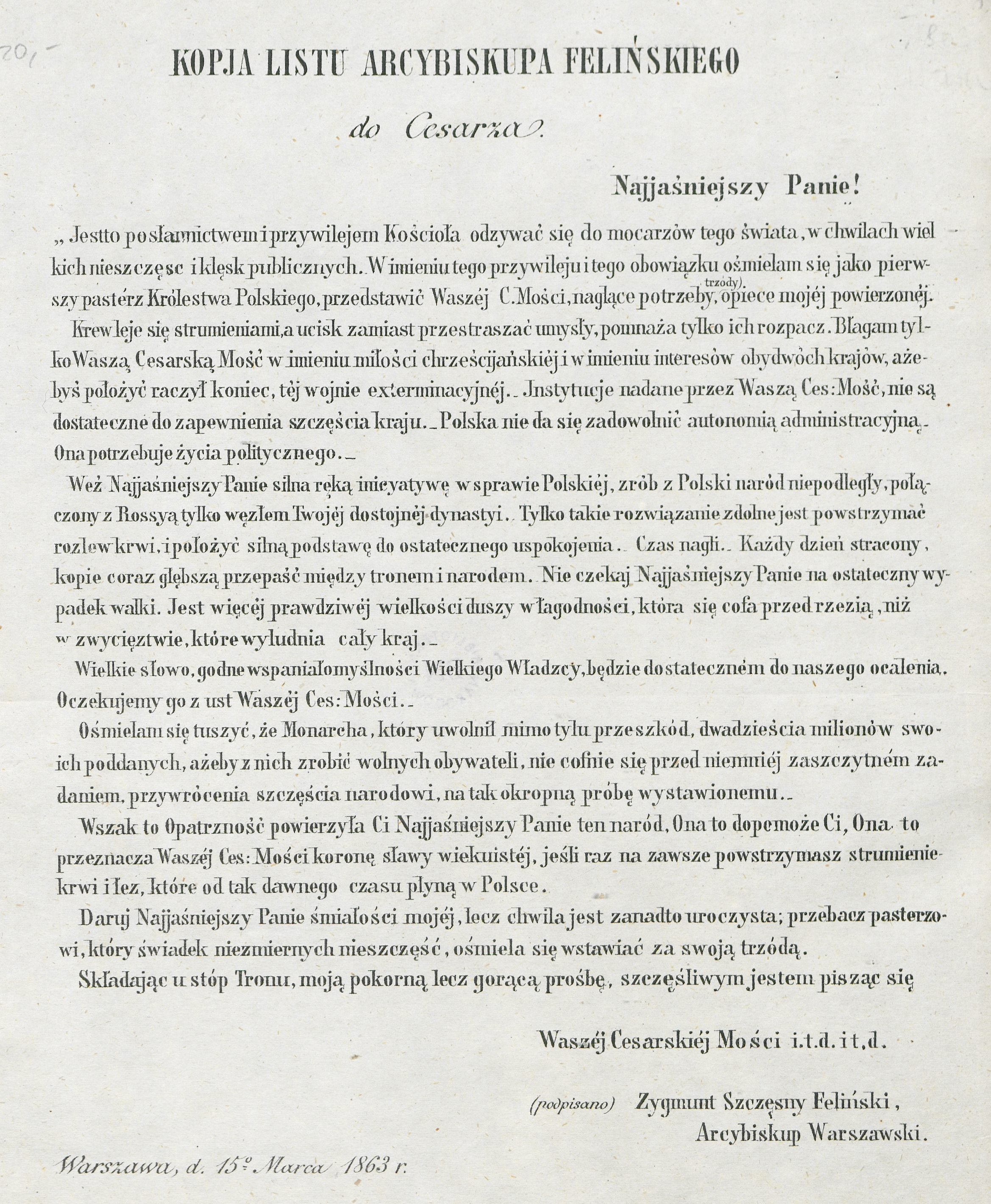 "Kopja listu Arcybiskupa Felińskiego do Cesarza.", [online] Warszawa: Narodowy Instytut Audiowizualny [dostęp 15.04.2026]. Dostępny w internecie: http://www.ipsb.nina.gov.pl/a/foto/kopja-listu-arcybiskupa-felinskiego-do-cesarza