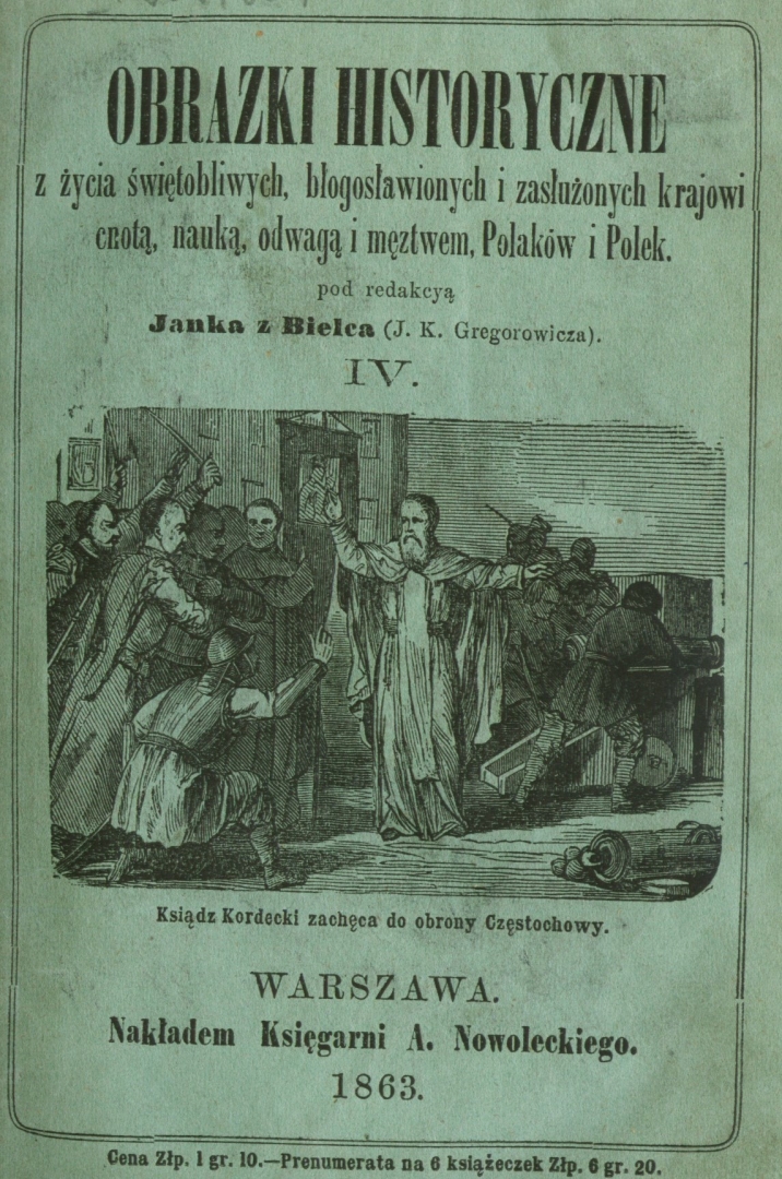 Okładka książki "Obrazki historyczne z życia świątobliwych błogosławionych i zasłużonych krajowi cnotą, nauką, odwagą i męztwem [!], Polaków i Polek. 4 : Ksiądz Augustyn Kordecki, przeor Paulinów, obrońca Kościoła i klasztoru na Jasnej Górze, stara historya" wydanej w 1963 roku.