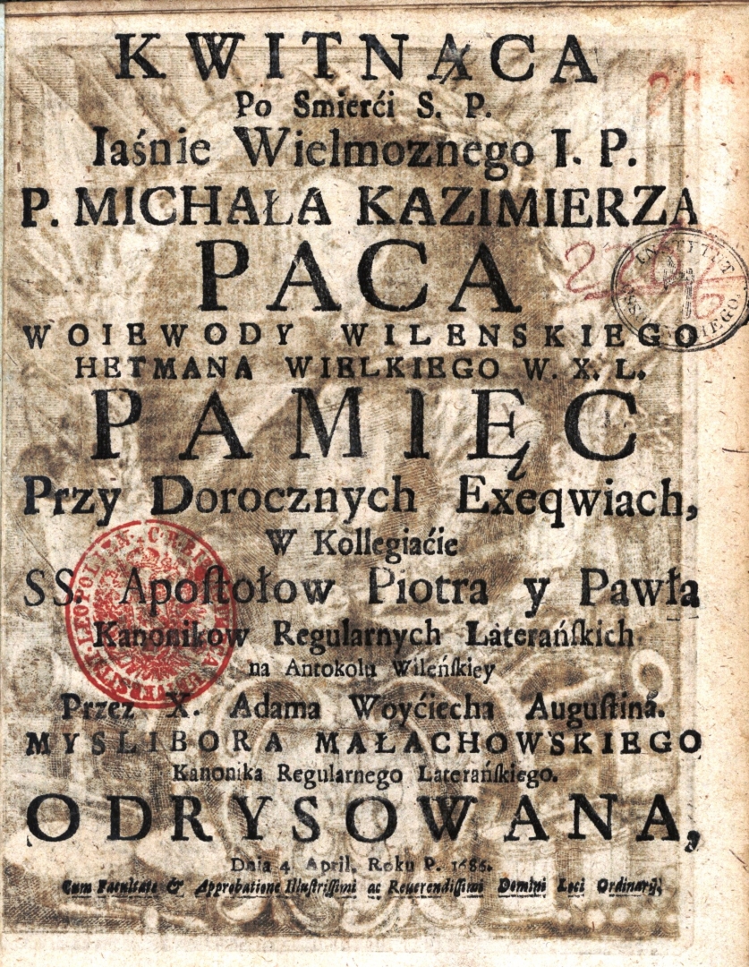 "Kwitnąca po smierci s.p. ... Michała Kazimierza Paca woiewody wilenskiego ... pamięc przy dorocznych exeqwiach w kollegiacie ss. Apostolow Piotra y Pawła ... na Antokolu Wileńskiey przez x. Adama Woyciecha Augustina Myslibora Małachowskiego ..."., [online] Warszawa: Narodowy Instytut Audiowizualny [dostęp 28.02.2026]. Dostępny w internecie: http://www.ipsb.nina.gov.pl/a/foto/kwitnaca-po-smierci-sp-michala-kazimierza-paca-woiewody-wilenskiego-pamiec-przy-dorocznych-exeqwiach-w-kollegiacie-ss-apostolow-piotra-y-pawla-na-antokolu-wilenskiey-przez-x-adama-woyciecha-augustina-myslibora-malachowskiego