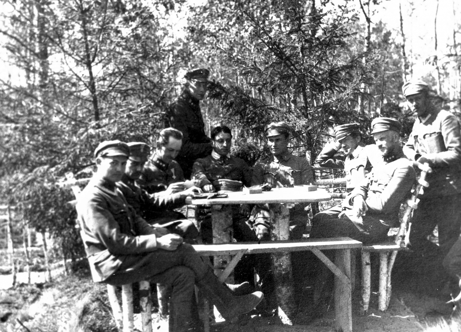 Obiad oficerów 4 pułku legionów na froncie w rezerwie. Siedzi bez czapki pułkownik Bolesław Roja.