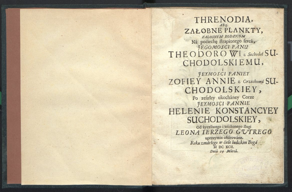 , Leon Jerzy Gutry "Threnodia abo załobne plankty zalosnym rodzicom na pociechę strapionego serca, [...]" (strona tytułowa, druk Dawid Fryderyk Rhete), [w:] Polski słownik biograficzny, t. ,