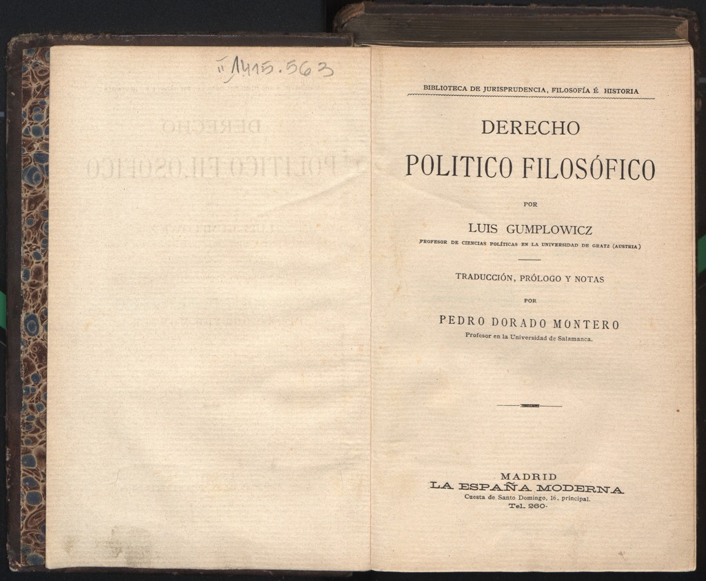 Ludwik Gumplowicz "Derecho politico filosófico" (strona tytułowa), [online] Warszawa: Narodowy Instytut Audiowizualny [dostęp 04.04.2026]. Dostępny w internecie: http://www.ipsb.nina.gov.pl/a/foto/ludwik-gumplowicz-derecho-politico-filosofico-strona-tytulowa