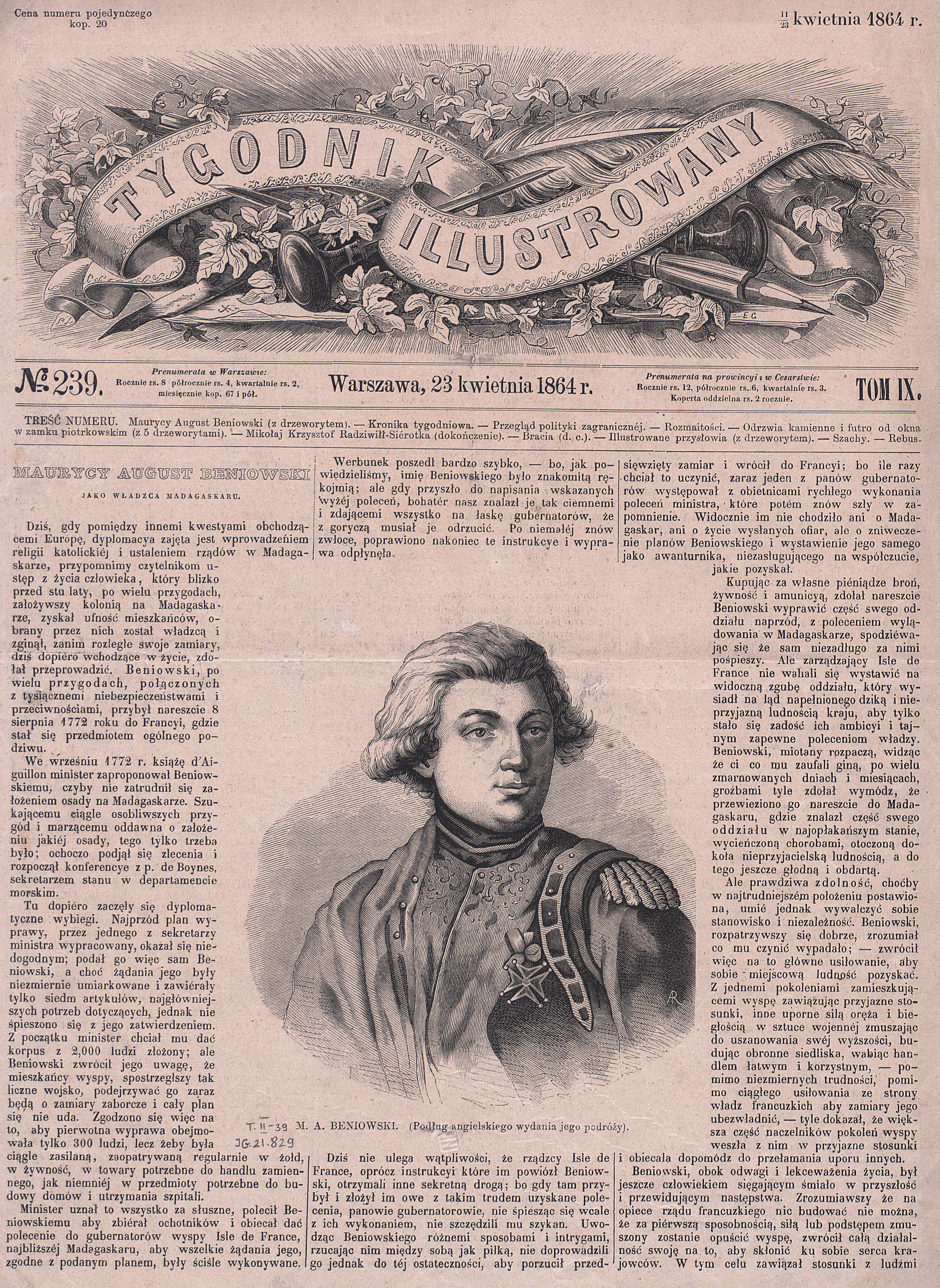 , Pierwsza strona czasopisma z artykułem o Maurycym Auguście Beniowskim., [w:] Polski słownik biograficzny, t. ,