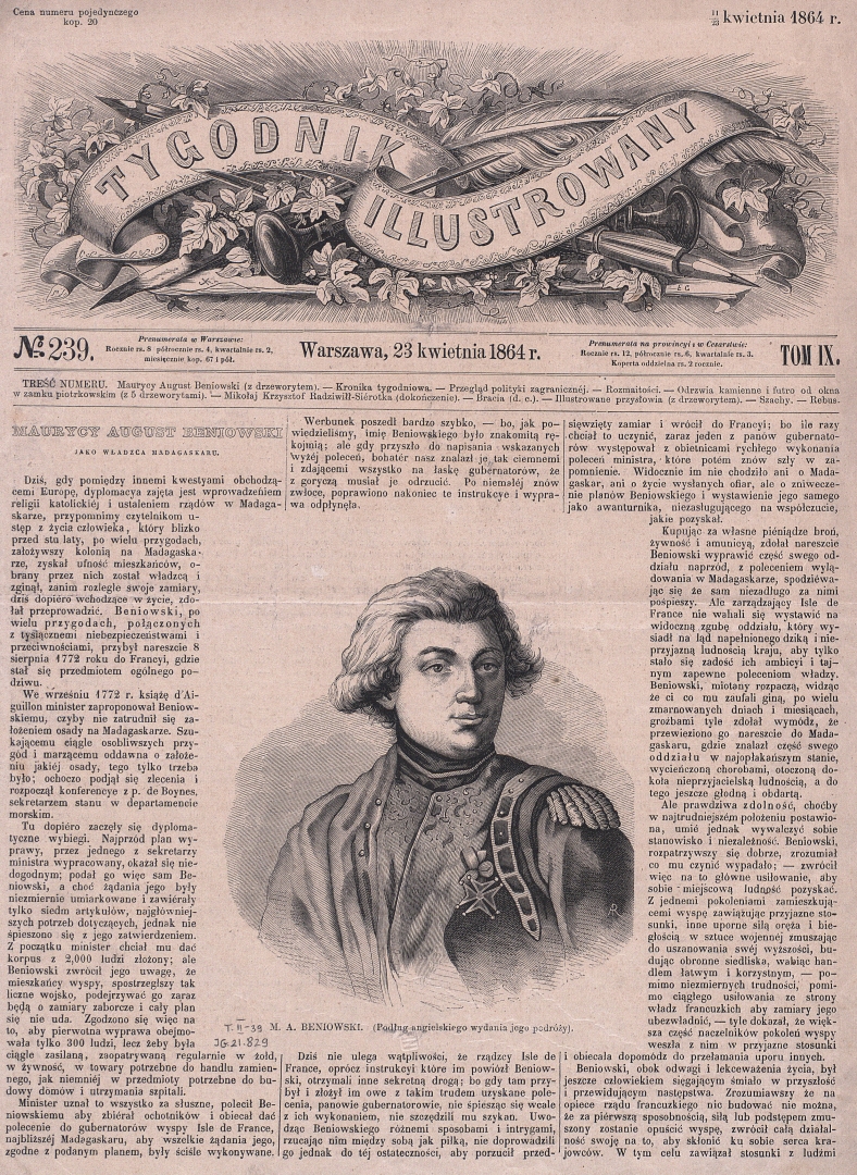 Pierwsza strona czasopisma z artykułem o Maurycym Auguście Beniowskim., [online] Warszawa: Narodowy Instytut Audiowizualny [dostęp 15.04.2026]. Dostępny w internecie: http://www.ipsb.nina.gov.pl/a/foto/m-a-beniowski-podlug-angielskiego-wydania-jego-podrozy-aleksandra-regulskiego