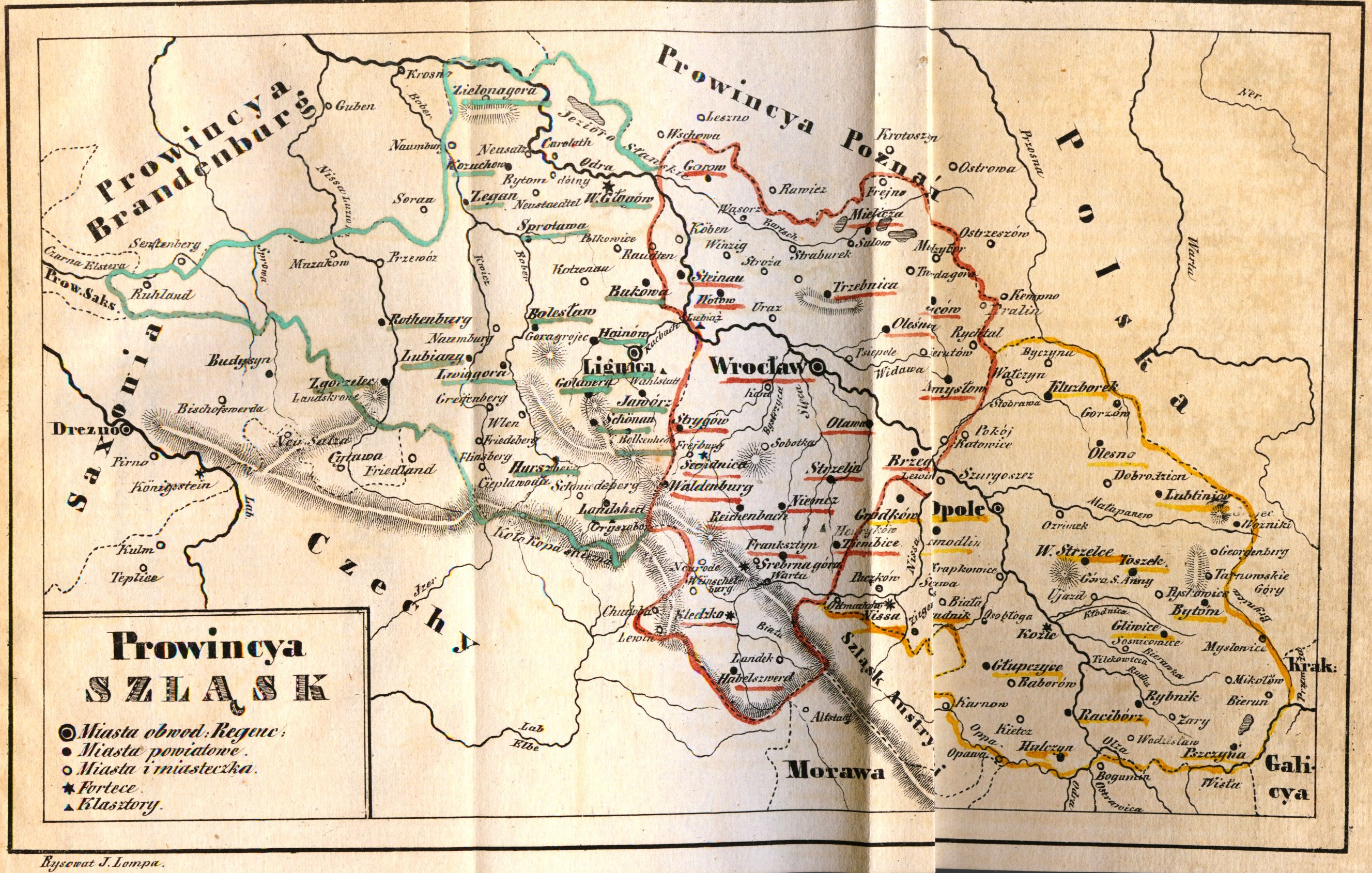 Mapa z "Krótkiego rysu jeografii Szląska dla nauki początkowej" Józefa Lompy., [online] Warszawa: Narodowy Instytut Audiowizualny [dostęp 28.02.2026]. Dostępny w internecie: http://www.ipsb.nina.gov.pl/a/foto/mapa-z-krotkiego-rysu-jeografii-szlaska-dla-nauki-poczatkowej-jozefa-lompy