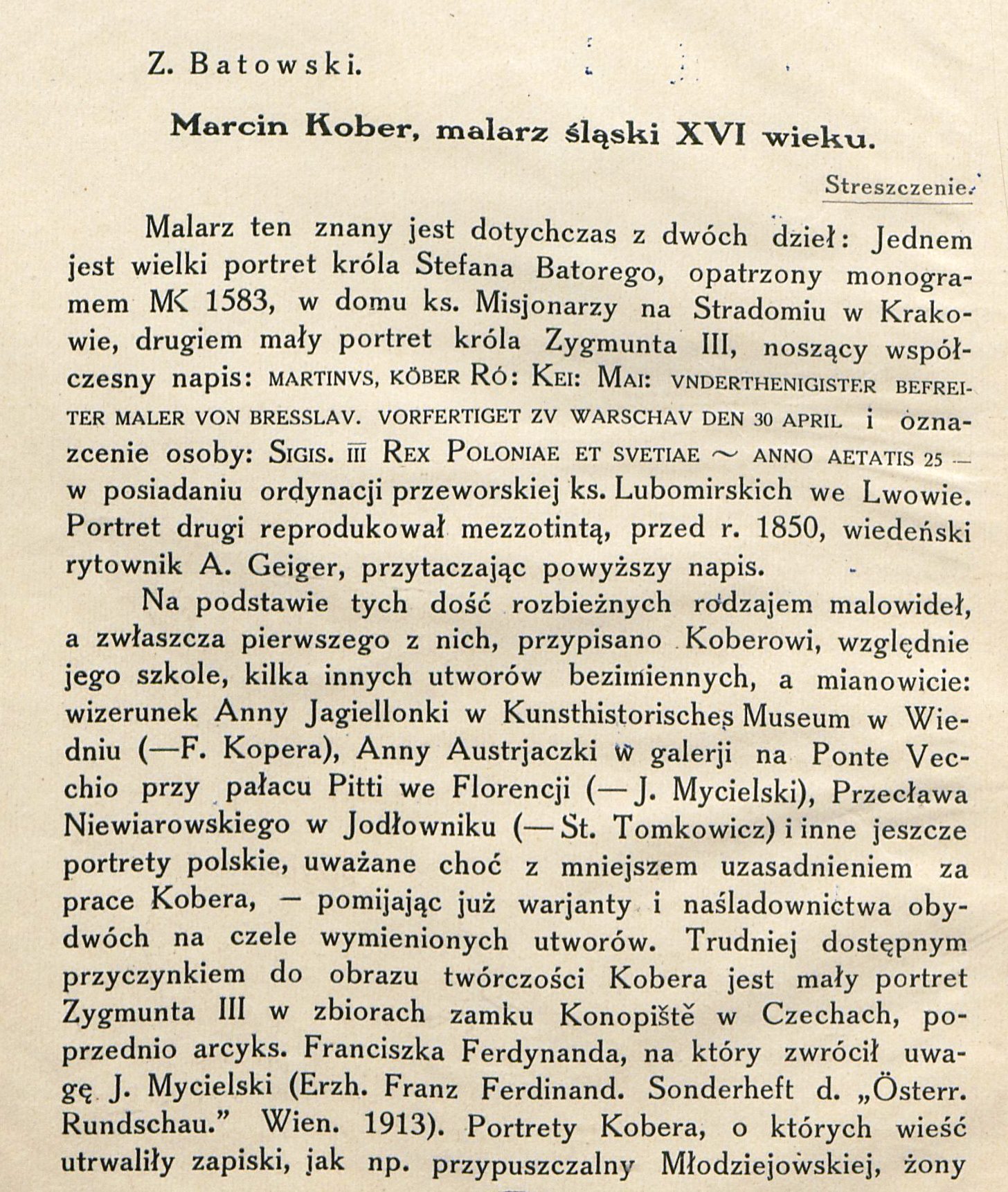 , "Marcin Kober, malarz śląski XVI wieku" Zygmunta Batowskiego,, [w:] Polski słownik biograficzny, t. ,