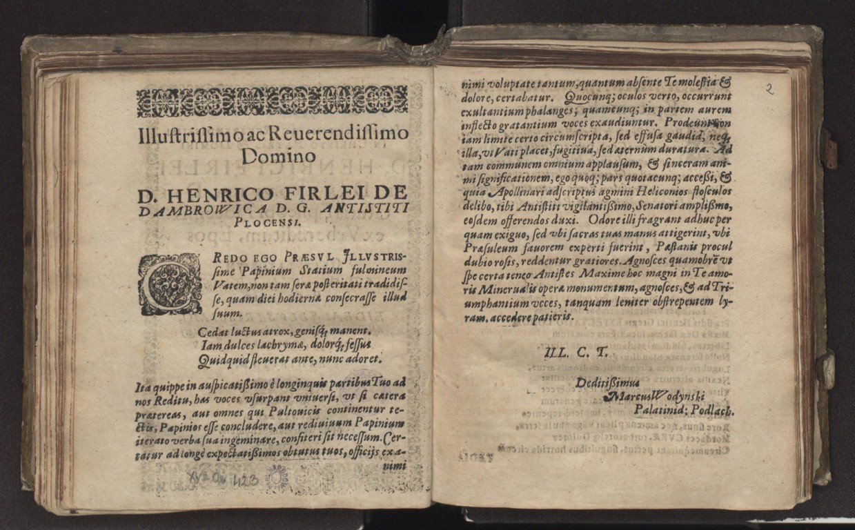 Marek Wodyński "In avspicatissimvm illvstrissimi [...] Henrici Firlei de Dambrovvica [...] episcopi Plocensis ex Vrbe reditum, epos gratvlatorivm a [...] Marco Wodynski, palatinide Podlachiae [...] nomine totius studiosae iuuentutius Collegij Pultouiensis Societatis Jesv exhibitvm." (druk Georg Schönfels; fragment)