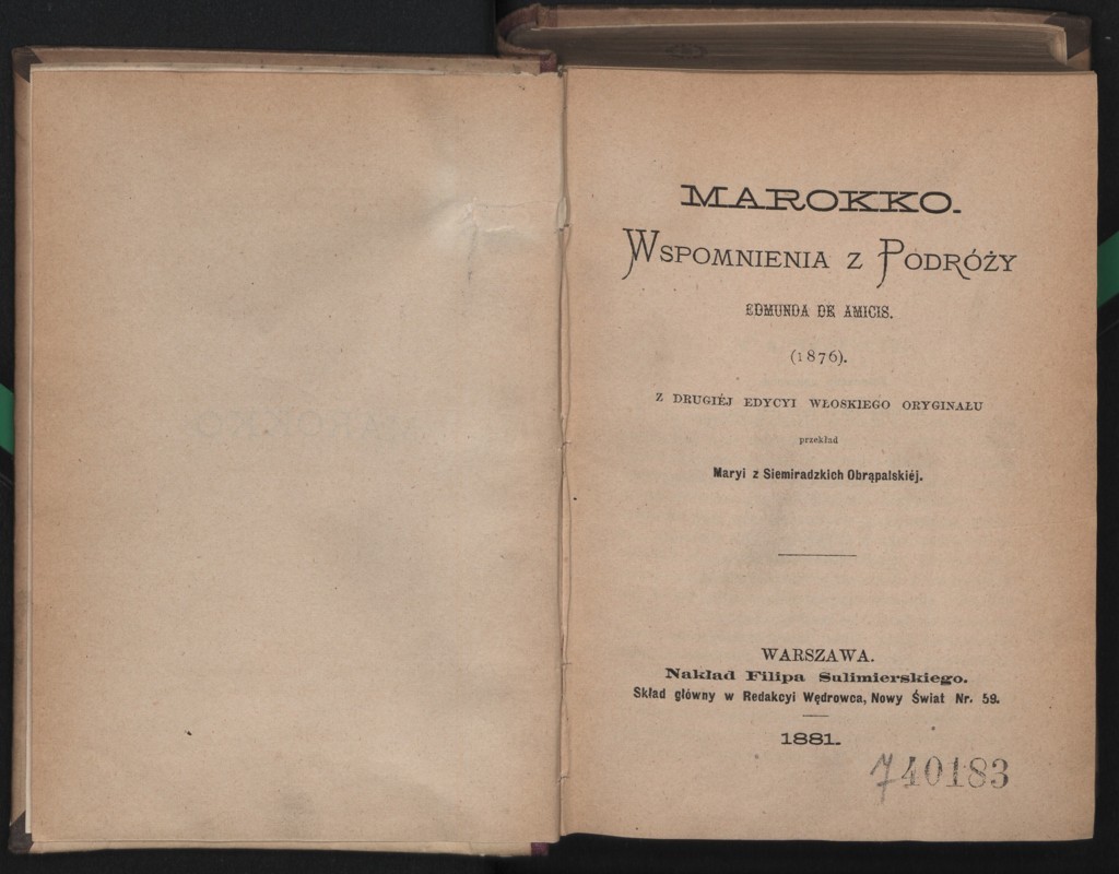 "Marokko: wspomnienia z podróży Edmunda de Amicis" (tłum. Maria Obrąpalska), [online] Warszawa: Narodowy Instytut Audiowizualny [dostęp 05.03.2026]. Dostępny w internecie: http://www.ipsb.nina.gov.pl/a/foto/marokko-wspomnienia-z-podrozy-edmunda-de-amicis-tlum-maria-obrapalska
