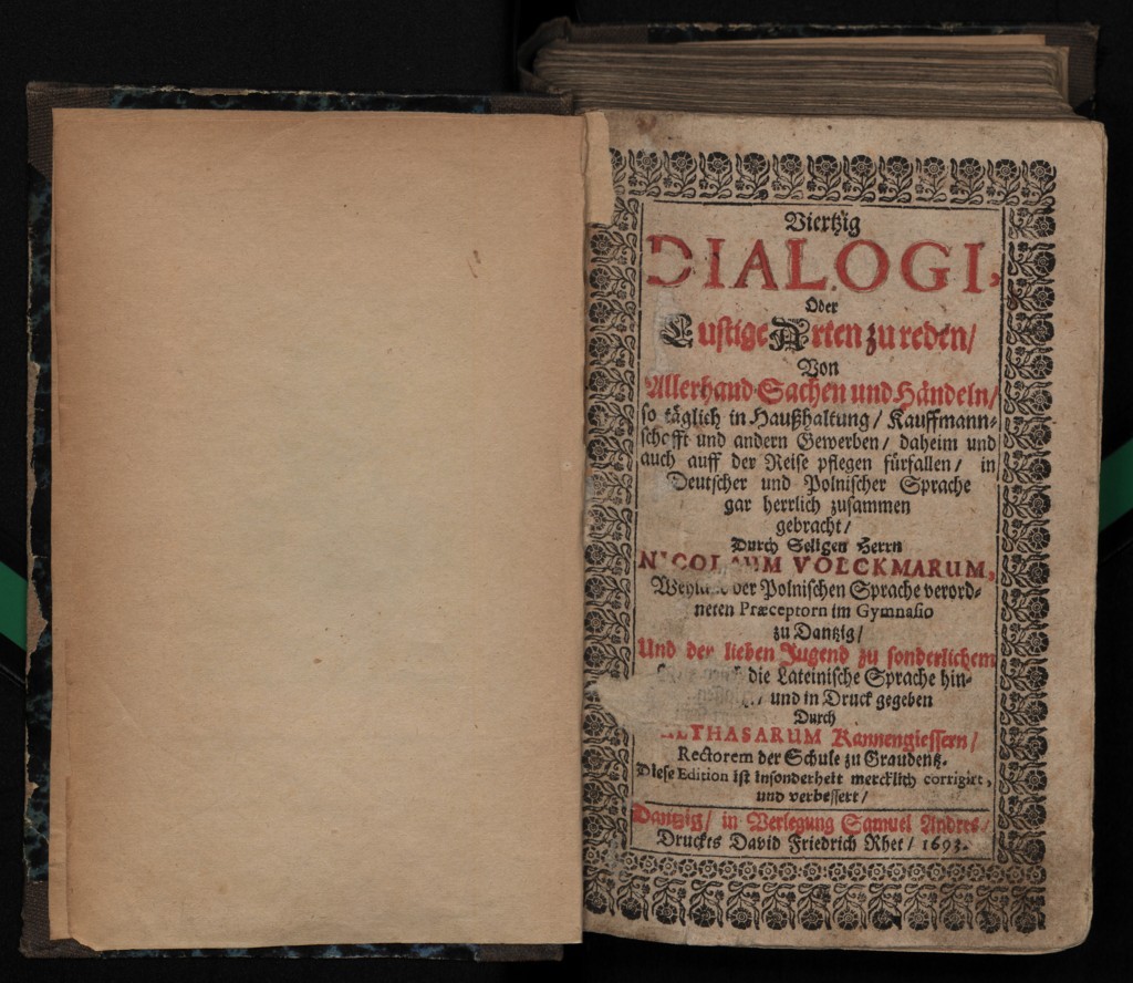 Mikołaj Volckmar "Viertzig Dialogi Oder Lustige Arten zu reden Von Allerhand Sachen und Händeln so täglich [...]" (strona tytułowa, druk Dawid Fryderyk Rhete), [online] Warszawa: Narodowy Instytut Audiowizualny [dostęp 14.04.2026]. Dostępny w internecie: http://www.ipsb.nina.gov.pl/a/foto/mikolaj-volckmar-viertzig-dialogi-oder-lustige-arten-zu-reden-von-allerhand-sachen-und-hndeln-so-tglich-strona-tytulowa-druk-dawid-fryderyk-rhete