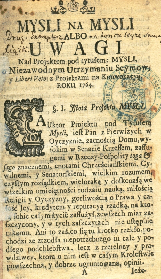 "Mysli na mysli, albo uwagi nad projektem pod tytułem: Mysli o niezawodnym utrzymaniu seymow y liberi veto z projektami na konwokacyą roku 1764" Stanisława Konarskiego., [online] Warszawa: Narodowy Instytut Audiowizualny [dostęp 05.03.2026]. Dostępny w internecie: http://www.ipsb.nina.gov.pl/a/foto/mysli-na-mysli-albo-uwagi-nad-projektem-pod-tytulem-mysli-o-niezawodnym-utrzymaniu-seymow-y-liberi-veto-z-projektami-na-konwokacya-roku-1764-stanislawa-konarskiego