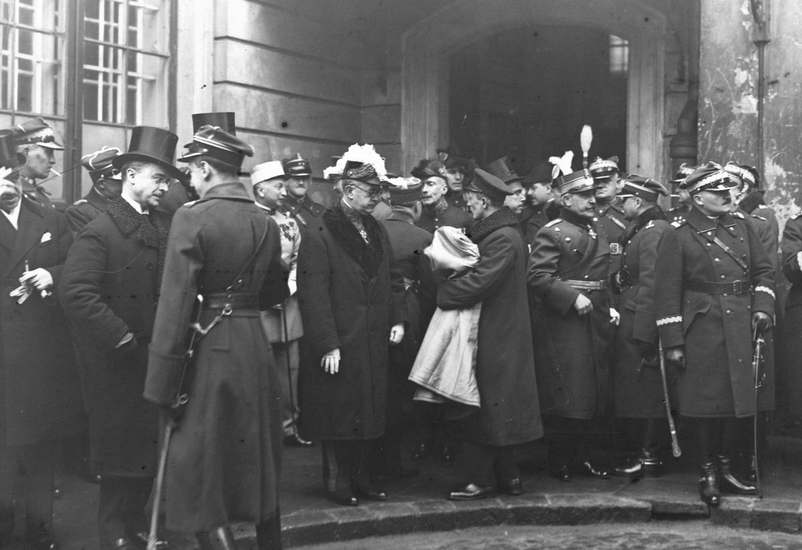 Przedstawiciele rządu i dyplomacji przed katedrą św. Jana po nabożeństwie ku czci marszałka Francji, Wielkiej Brytanii i Polski Frerdynanda Focha. Widoczni m.in.: generał Gustaw Orlicz Dreszer (z lewej z papierosem w ustach), płk Józef Beck (z lewej tyłem), ambasador Francji w Polsce Jules Laroche (w środku w stroju galowym), radca Ambasady Francji w Polsce Jean Trippier (za oficerem trzymającym w ręku jasnym płaszczu), generał rumuński Yeteanu (trzeci z prawej w pierwszym rzędzie) oraz generał Józef Rybak (pierwszy z prawej w pierwszym rzędzie).