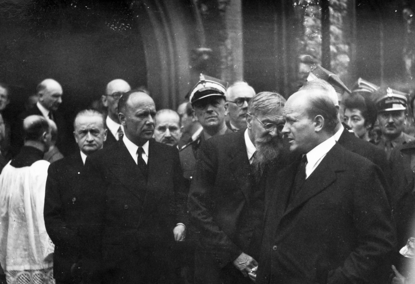 Przedstawiciele władz opuszczają kościół. Na pierwszym planie od lewej: poseł Władysław Banaczyk, Stanisław Grabski, wicepremier Stanisław Mikołajczyk. Na drugim planie od lewej: minister Henryk Strasburger, poseł Michał Kwiatkowski, gen. Bronisław Regulski. Fotografię wykonał Czesław Datka.