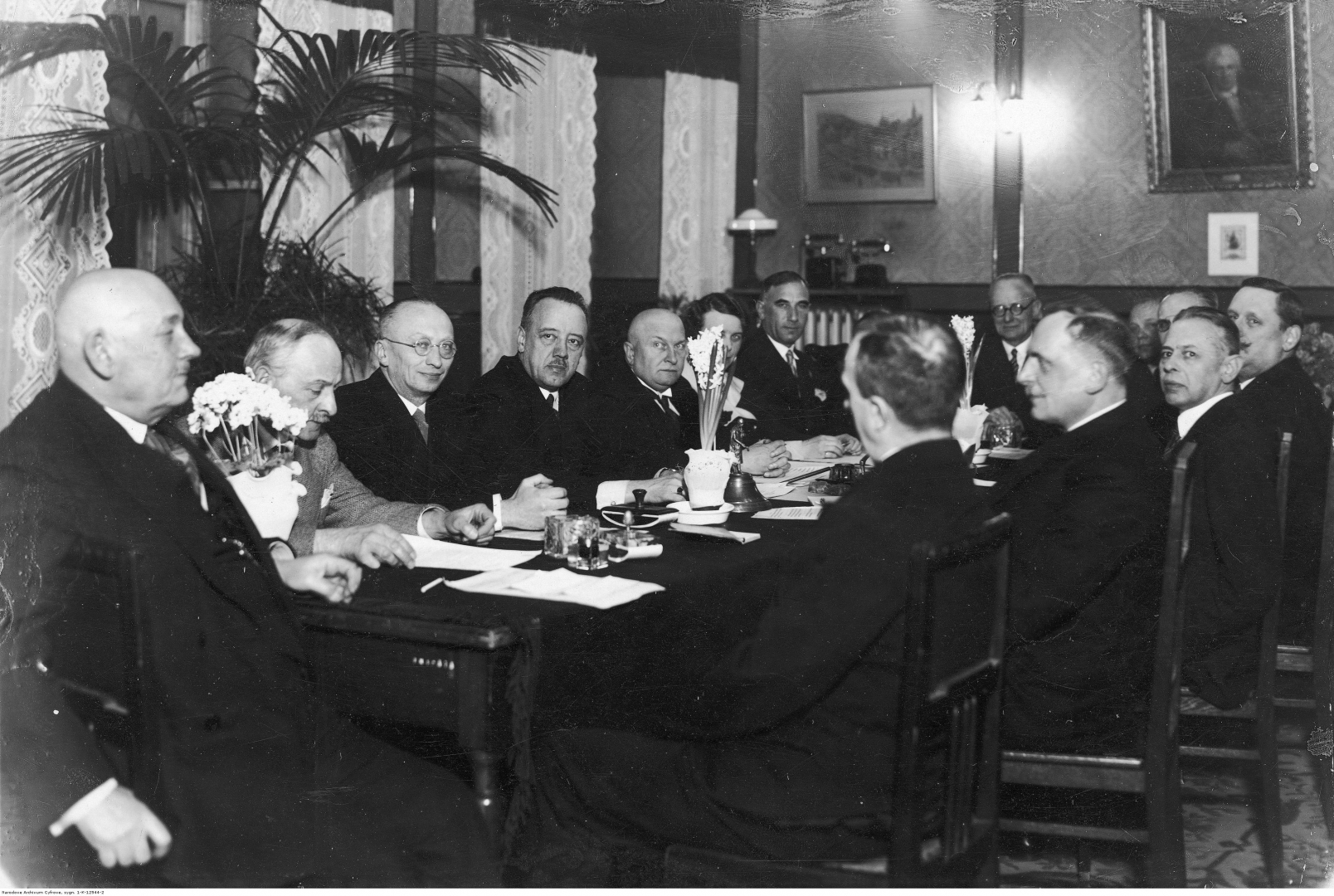 Jury nagrody artystycznej. Widoczni m.in.: malarz Konstanty Wróblewski (1. z lewej), malarz Zygmunt Kamiński (3. z lewej), rzeźbiarz Mieczysław Lubelski (7. z lewej), malarz Edward Okuń, Feliks Łopieński, prezydent Warszawy Zygmunt Słomiński (4. z lewej), sekretarka Janina Żochowska, wiceprezes Rady Miejskiej w Warszawie Stanisław Wilczyński, (nagrodę otrzymała malarka Zofia Stankiewicz).