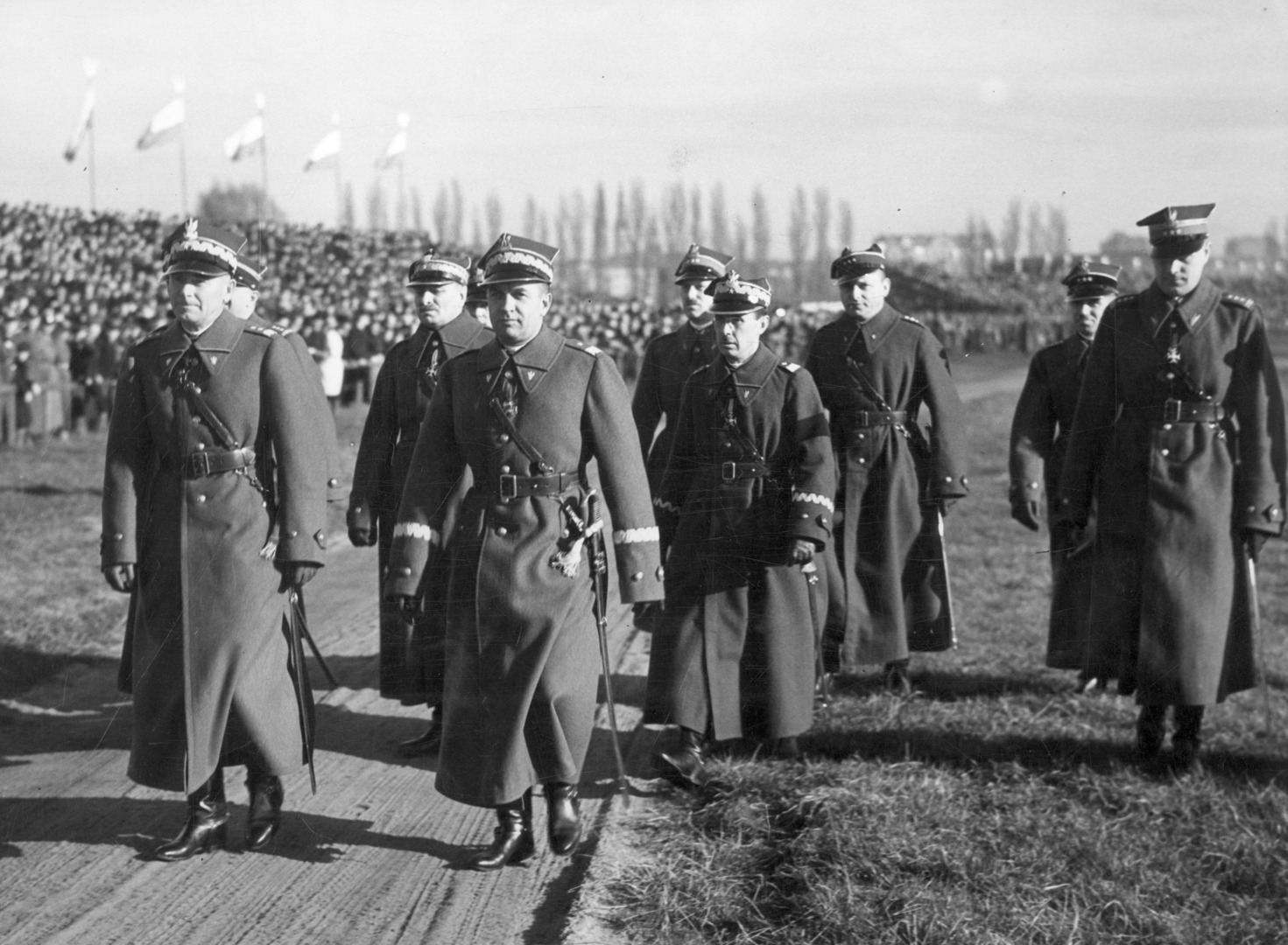 Przybycie władz wojskowych na defiladę na Polu Mokotowskim. Widoczni m.in. Generalny Inspektor Sił Zbrojnych generał Edward Rydz-Śmigły (z lewej), minister spraw wojskowych generał Tadeusz Kasprzycki (I rząd 2. z lewej), wiceminister spraw wojskowych generał Felicjan Sławoj Składkowski (II rząd z lewej), szef Sztabu Głównego generał Wacław Stachiewicz (II rząd 2. z prawej).