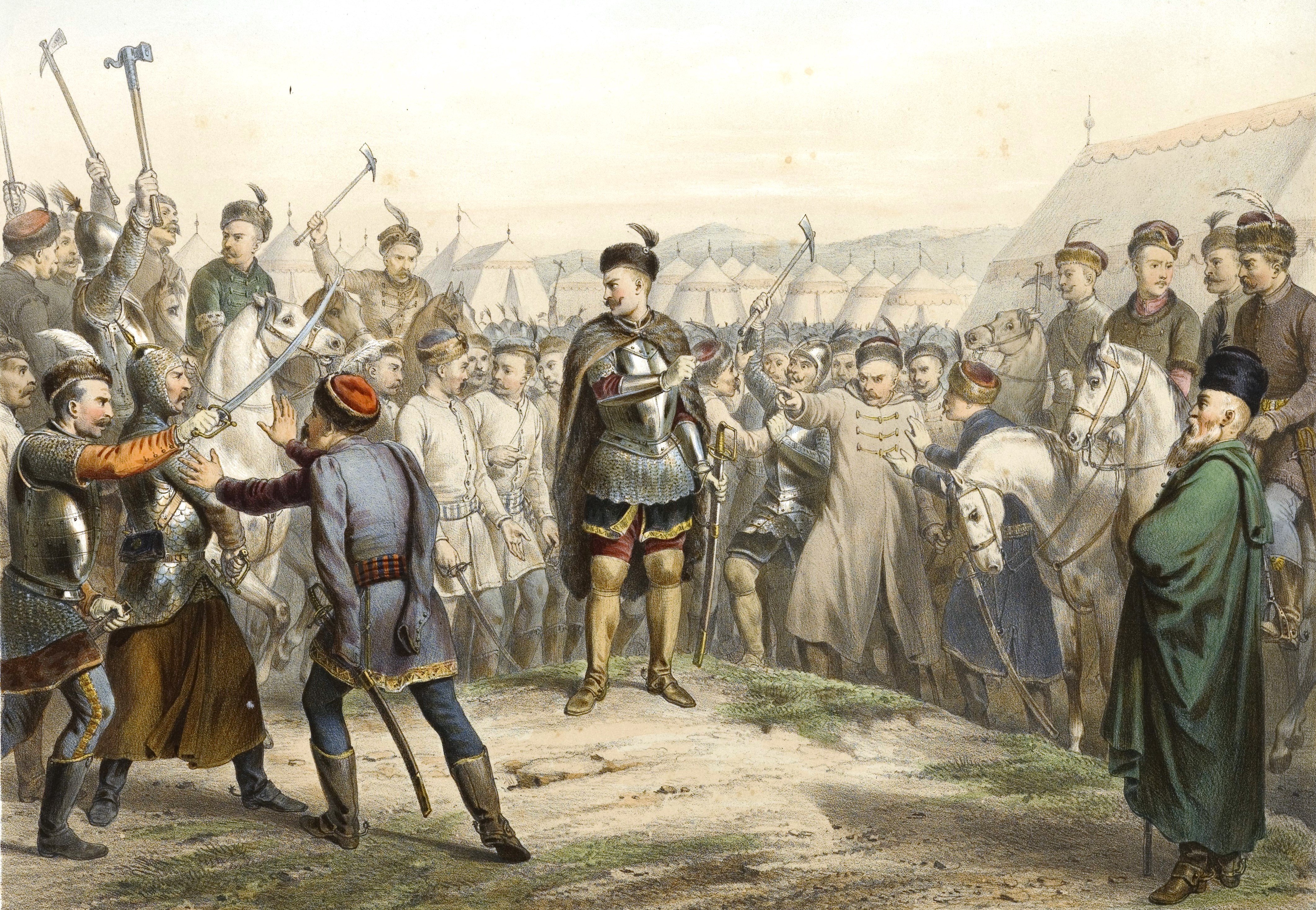 Obrazy z Pamiętników J. C. Paska - J. C. Pasek nie chce przysięgać w kole rycerskim"., [online] Warszawa: Narodowy Instytut Audiowizualny [dostęp 03.04.2026]. Dostępny w internecie: http://www.ipsb.nina.gov.pl/a/foto/obrazy-z-pamietnikow-j-c-paska-j-c-pasek-nie-chce-przysiegac-w-kole-rycerskim