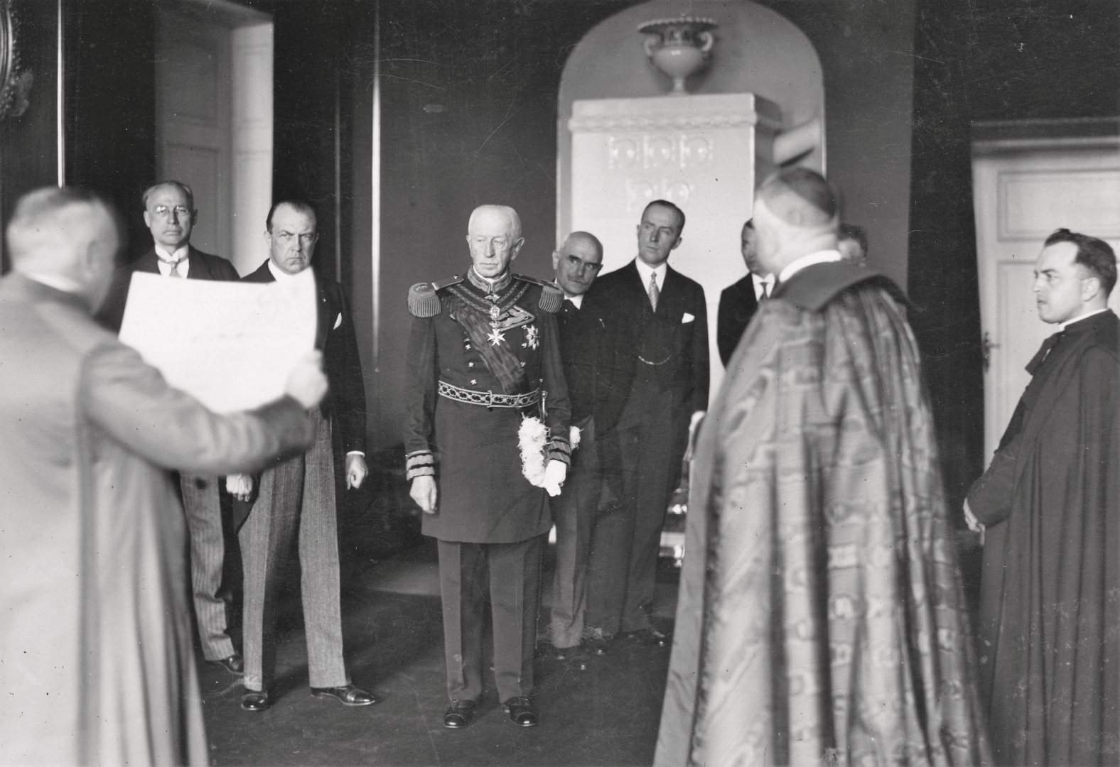 Książę szambelan Czapski odczytuje bullę Wielkiego Mistrza Zakonu Kawalerów Maltańskich. Z prawej widoczny Prymas August Hlond (odwrócony) oraz dr Bogdan Hutten-Czapski (w środku). W uroczystoci wzięli także udział członkowie Zarządu Związku Polskich Kawalerów Maltańskich oraz krewni i przyjaciele odznaczonego. Widoczni m.in.: hr. Stanisław Taczanowski (2. z lewej), hr. Koczorowski (1. z lewej), hr. Stanisław Breza (na prawo za Czapskim, wychyla się), hr. Emeryk Hutten-Czapski (6. z lewej), kapelan Prymasa ks. Wojciechowski (1. z prawej).
