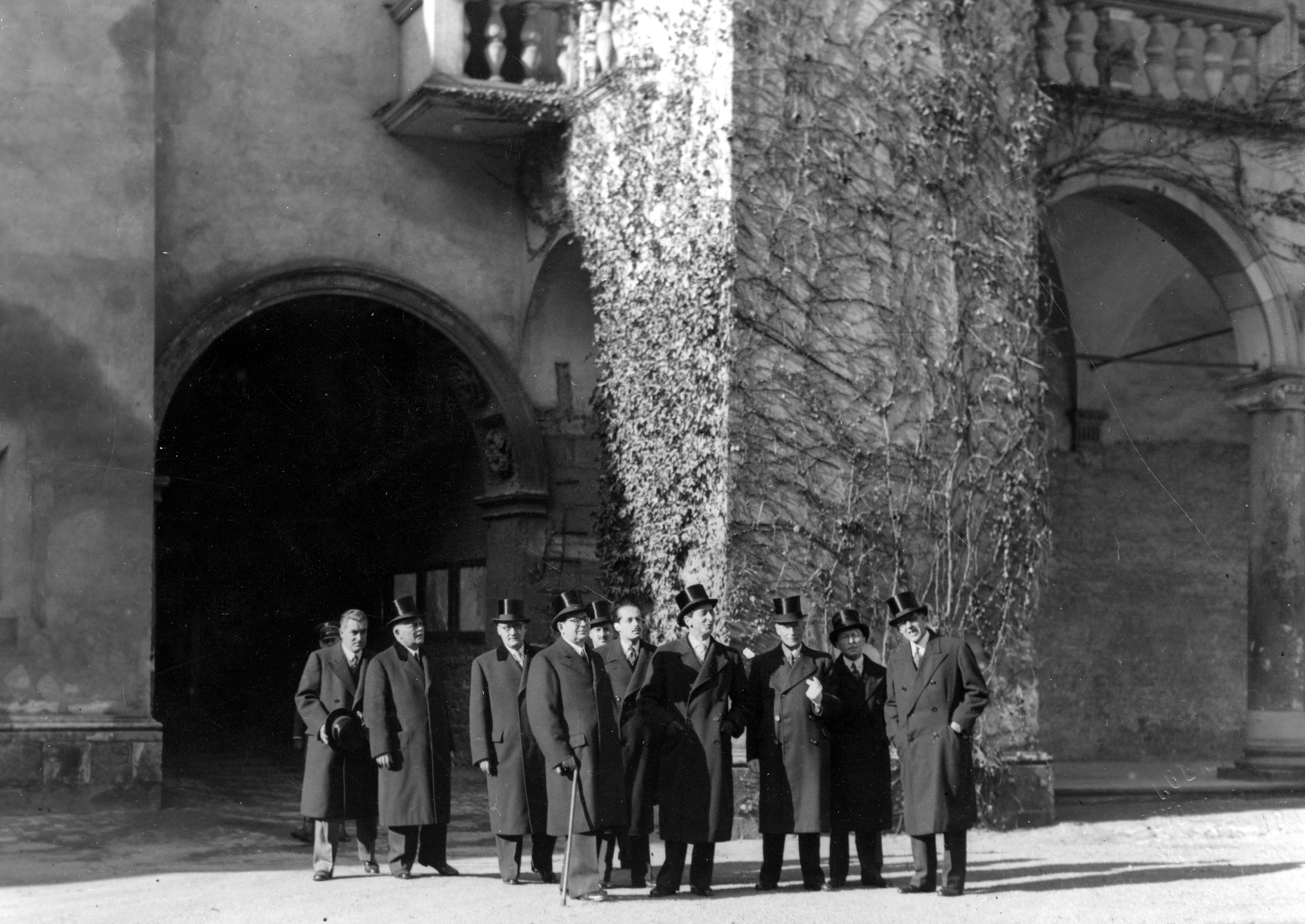 Minister spraw zagranicznych Austrii Guido Schmidt (na pierwszym planie drugi z lewej) podczas zwiedzania Zamku Królewskiego w Krakowie w towarzystwie przedstawicieli Poselstwa Austrii i władz Krakowa. Na dziedzińcu Wawelu obok ministra widoczni: poseł nadzwyczajny i minister pełnomocny Austrii w Polsce Henryk Schmidt (pierwszy z lewej na pierwszym planie), hrabia Ksawery Pusłowski (trzeci z prawej) i były poseł nadzwyczajny i minister pełnomocny Austrii w Polsce Maksymilian Hoffinger (pierwszy z prawej).
