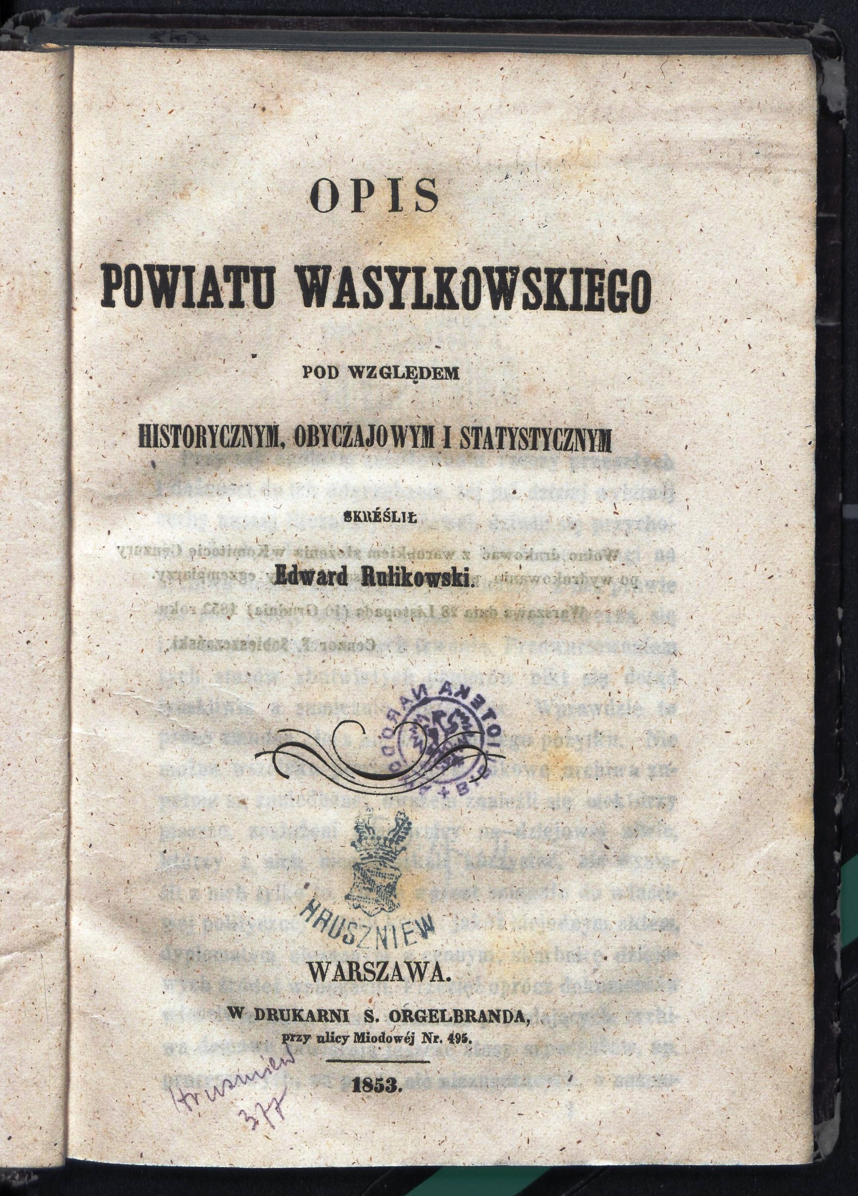 "Opis powiatu wasylkowskiego pod względem historycznym, obyczajowym i statystycznym" Edwarda Rulikowskiego., [online] Warszawa: Narodowy Instytut Audiowizualny [dostęp 03.04.2026]. Dostępny w internecie: http://www.ipsb.nina.gov.pl/a/foto/opis-powiatu-wasylkowskiego-pod-wzgledem-historycznym-obyczajowym-i-statystycznym-edwarda-rulikowskiego