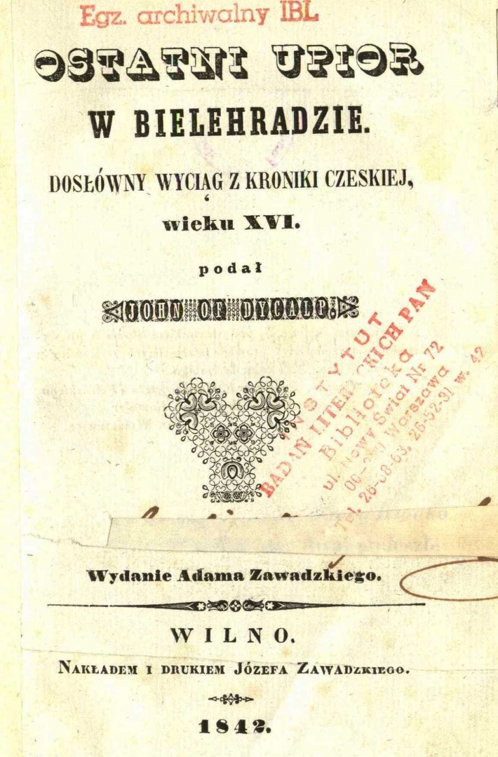 "Ostatni upiór w Bielehradzie : dosłówny wyciąg z kroniki czeskiej wieku XVI" Placyda Jankowskiego., [online] Warszawa: Narodowy Instytut Audiowizualny [dostęp 12.03.2026]. Dostępny w internecie: http://www.ipsb.nina.gov.pl/a/foto/ostatni-upior-w-bielehradzie-doslowny-wyciag-z-kroniki-czeskiej-wieku-xvi-placyda-jankowskiego