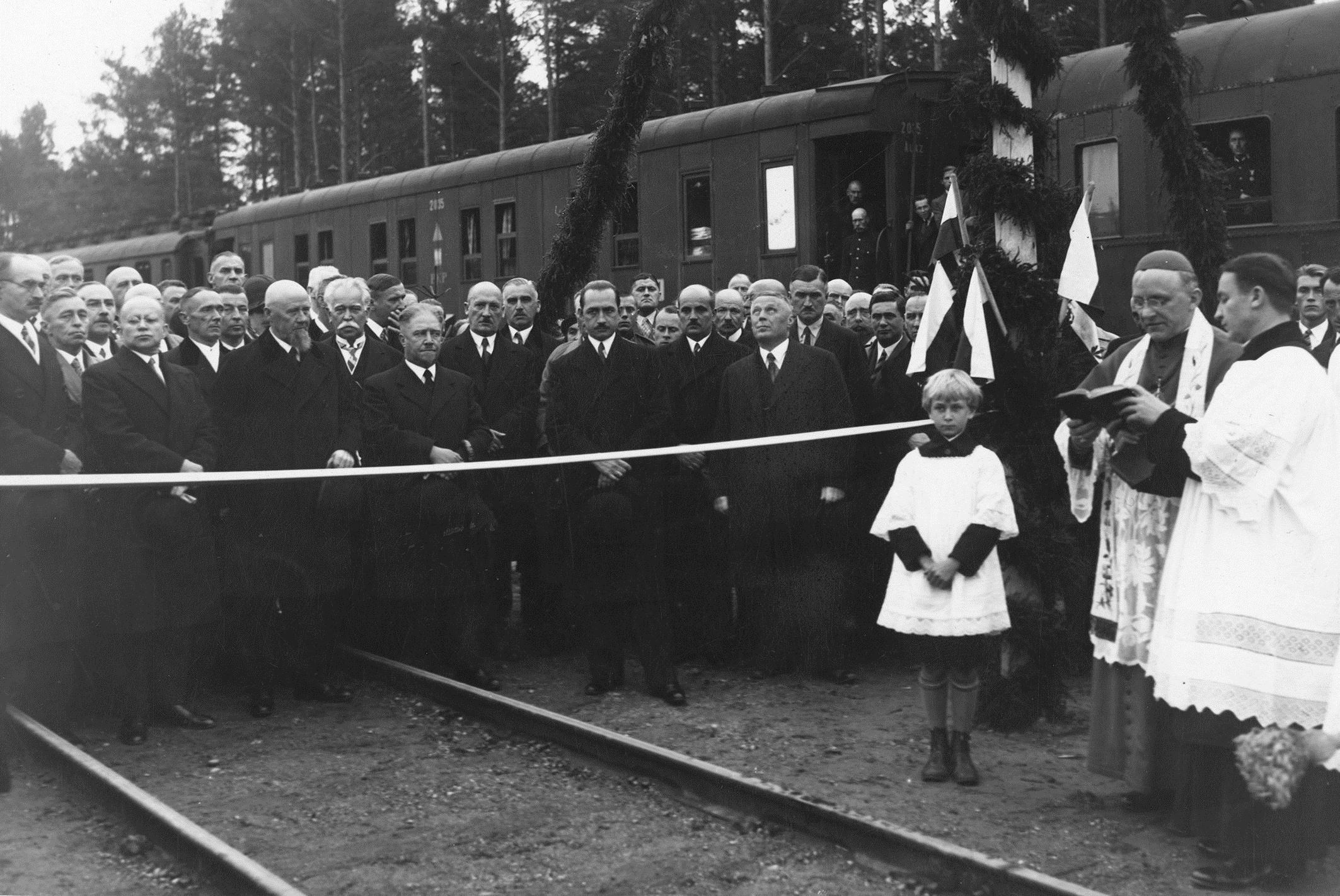 Uroczyste poświęcenie dokonane przez arcybiskupa Romualda Jałbrzykowskiego w Druskienikach. W pierwszym rzędzie od lewej stoją: wiceminister pracy i opieki społecznej Eugeniusz Piestrzyński, minister komunikacji Michał Butkiewicz, poseł Aleksander Prystor, Jakub Marian Krzemieński, wiceminister komunikacji Julian Piasecki.