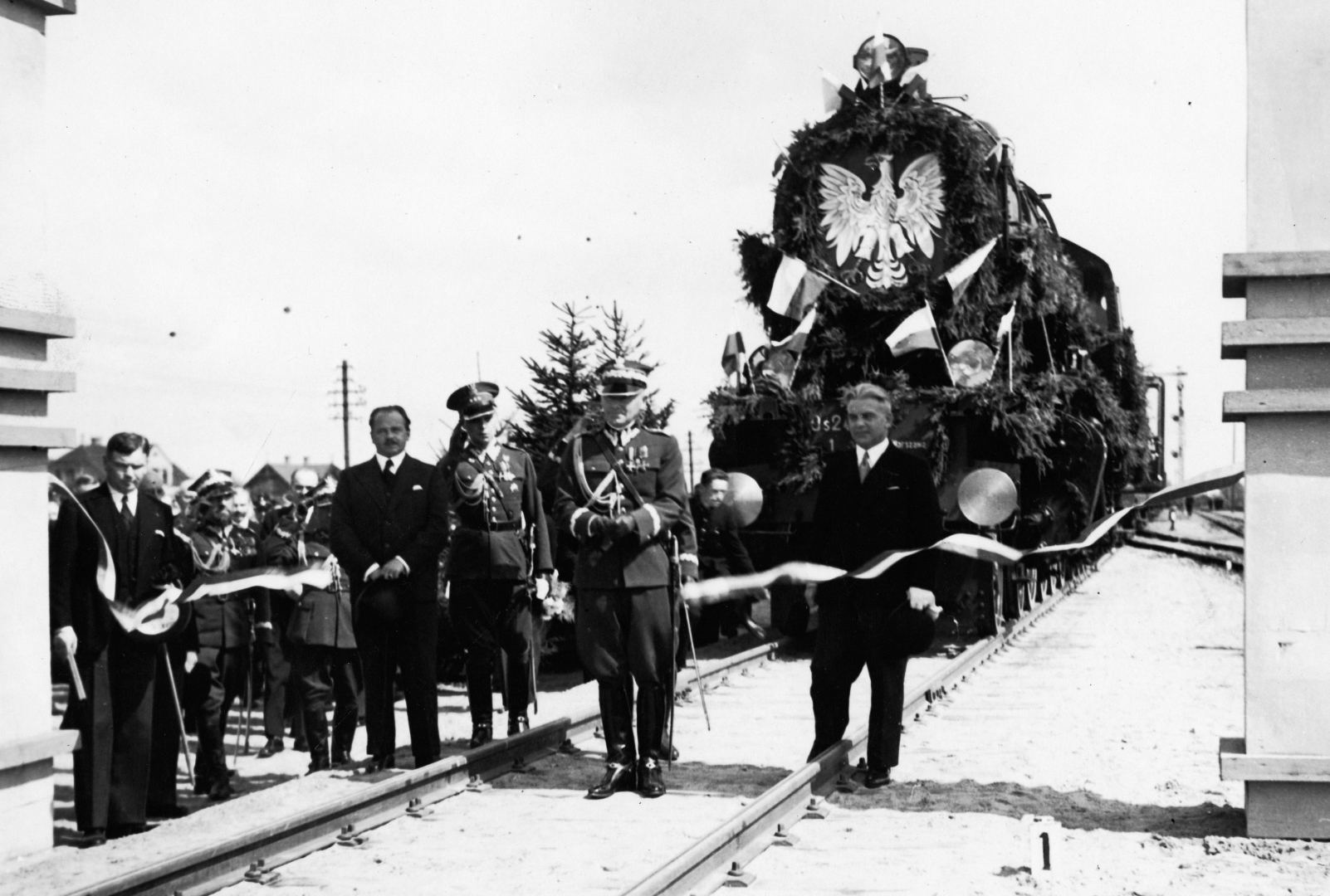 Gen. Edward Śmigły-Rydz po przecięciu wstęgi podczas uroczystości otwarcia w Tłuszczu. Widoczni m.in.: minister komunikacji Juliusz Ulrych (1. z prawej na pierwszym planie), minister opieki społecznej Marian Zyndram Kościałkowski (4. z prawej), adiutant gen. Edwarda Śmigłego-Rydza rotmistrz Edward Mańkowski (stoi na prawo za ministrem Kościałkowskim, salutuje), gen. Kordian Józef Zamorski (w głębi z lewej, za wstęgą). W tle udekorowany flagami i godłem państwowym parowóz Os 24.