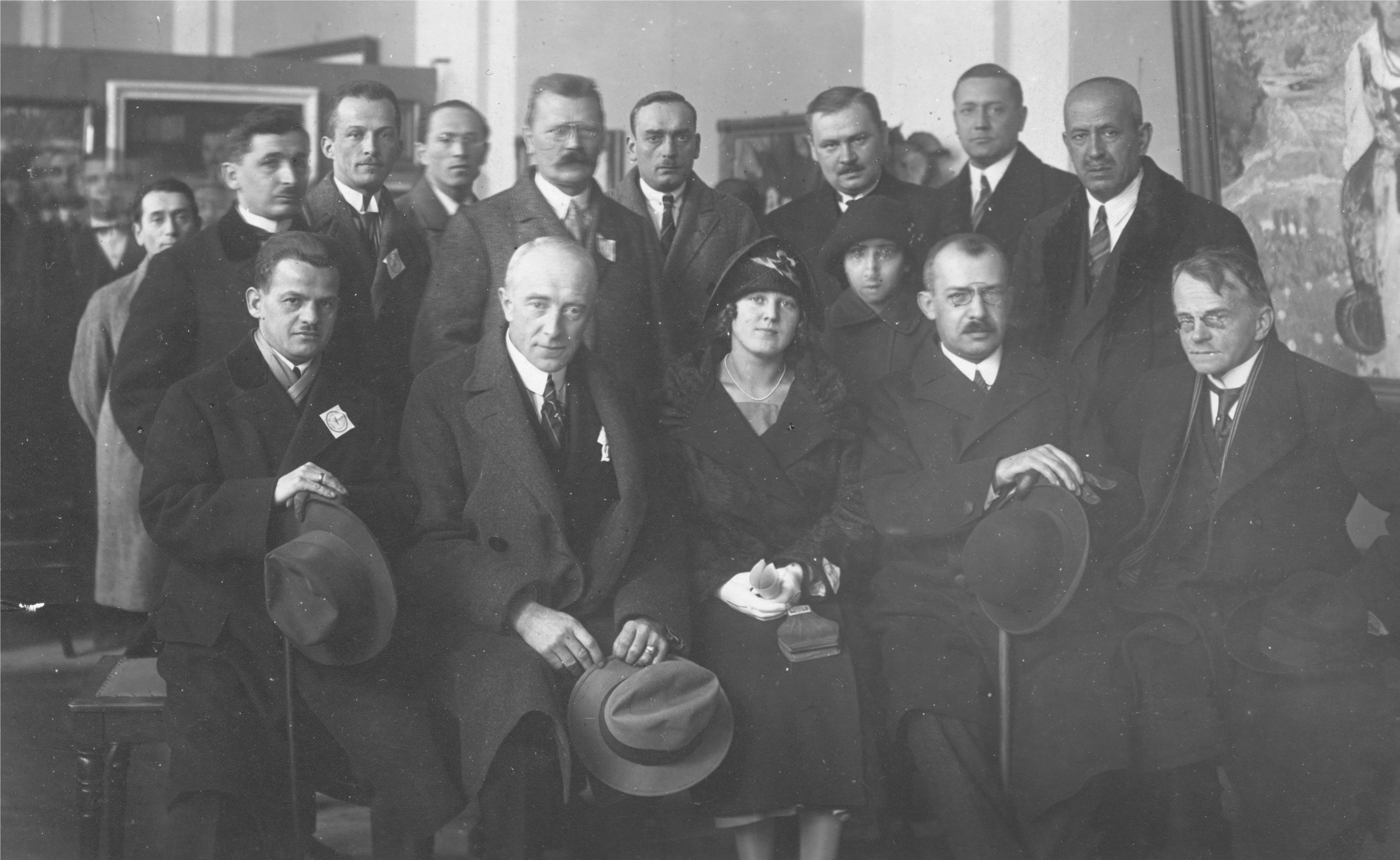 Uczestnicy otwarcia wystawy. Siedzą od lewej: prof. Bolesław Fichna, prof. Ignacy Pieńkowski, pani Fichna, prezydent Łodzi Marian Cynarski, prof. Józef Mehoffer, Marian Dienstl-Dąbrowa (stoi 3. z prawej).