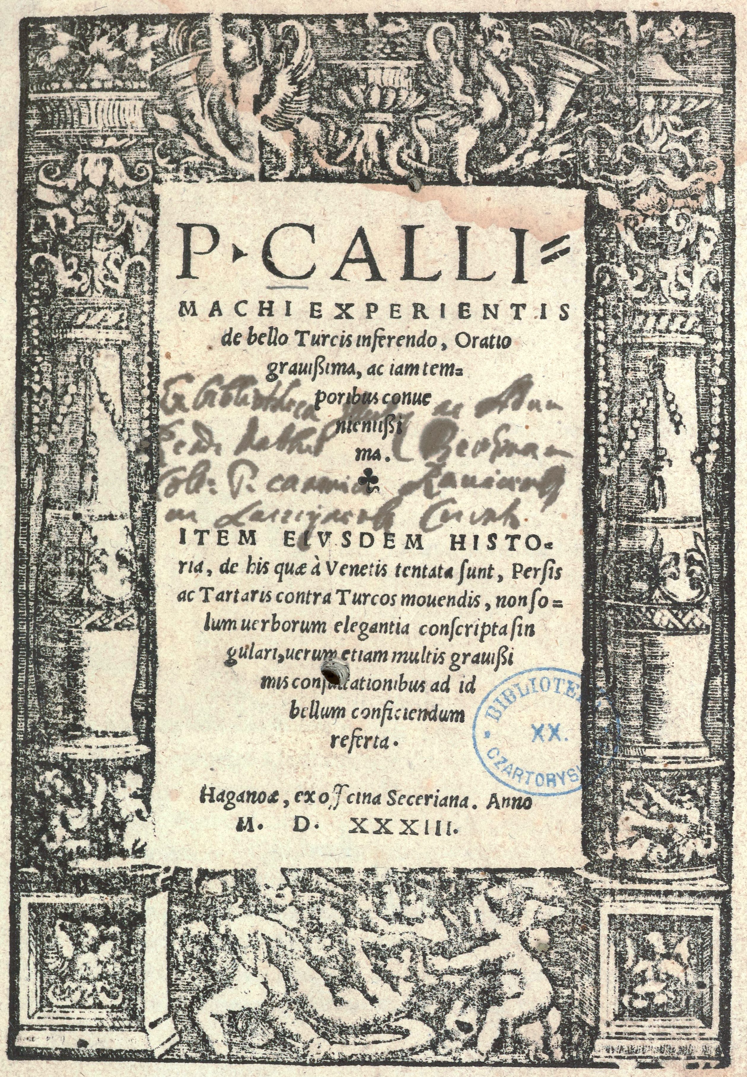 "P. Callimachi experientis de bello Turcis inferendo, oratio grauissima, ac iam temporibus conuenienussima. Item eivsdem historia, de his quae a Venetis tentata sunt, Persis ac Tartaris contra Turcos mouendis, non solum uerborum elegantia conscripta singu, [online] Warszawa: Narodowy Instytut Audiowizualny [dostęp 13.04.2026]. Dostępny w internecie: http://www.ipsb.nina.gov.pl/a/foto/p-callimachi-experientis-de-bello-turcis-inferendo-oratio-grauissima-ac-iam-temporibus-conuenienussima-item-eivsdem-historia-de-his-quae-a-venetis-tentata-sunt-persis-ac-tartaris-contra-turcos-mouendis-non-solum-uerborum-elegantia-conscripta-singular
