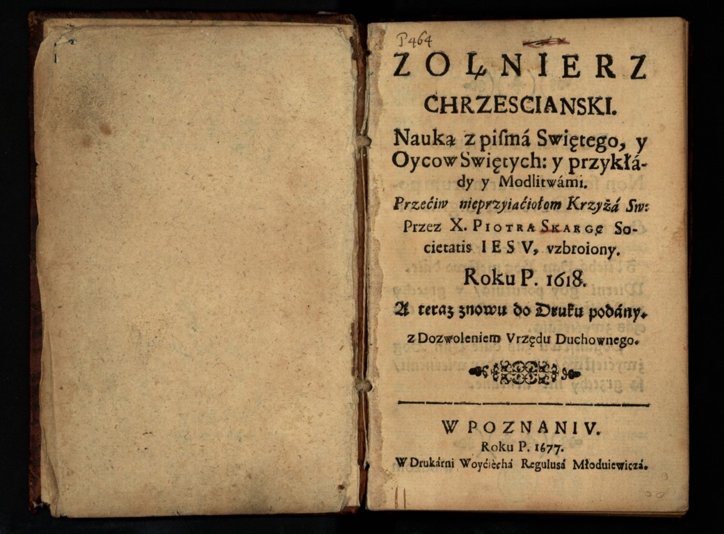 Piotr Skarga "Zołnierz chrzescianski: nauka z Pisma Swietego y oycow swiętych y przykłady y modlitwami przeciw nieprzyiaciołom Krzyża Sw. przez Piotra X. Skargę ... vzbroiony roku P. 1618, a teraz znowu do druku podany ..." (strona tytułowa), [online] Warszawa: Narodowy Instytut Audiowizualny [dostęp 14.04.2026]. Dostępny w internecie: http://www.ipsb.nina.gov.pl/a/foto/piotr-skarga-zolnierz-chrzescianski-nauka-z-pisma-swietego-y-oycow-swietych-y-przyklady-y-modlitwami-przeciw-nieprzyiaciolom-krzyza-sw-przez-piotra-x-skarge-vzbroiony-roku-p-1618-a-teraz-znowu-do-druku-podany-strona-tytulowa