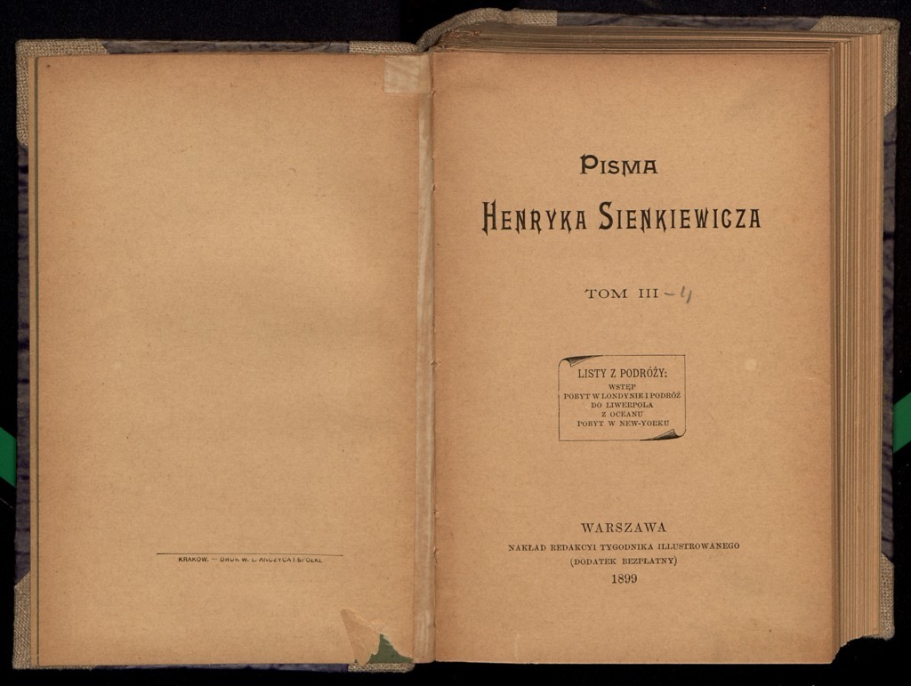 "Pisma Henryka Sienkiewicza. T. 3, Listy z podróży." (strona tytułowa), [online] Warszawa: Narodowy Instytut Audiowizualny [dostęp 13.04.2026]. Dostępny w internecie: http://www.ipsb.nina.gov.pl/a/foto/pisma-henryka-sienkiewicza-t-3-listy-z-podrozy-strona-tytulowa