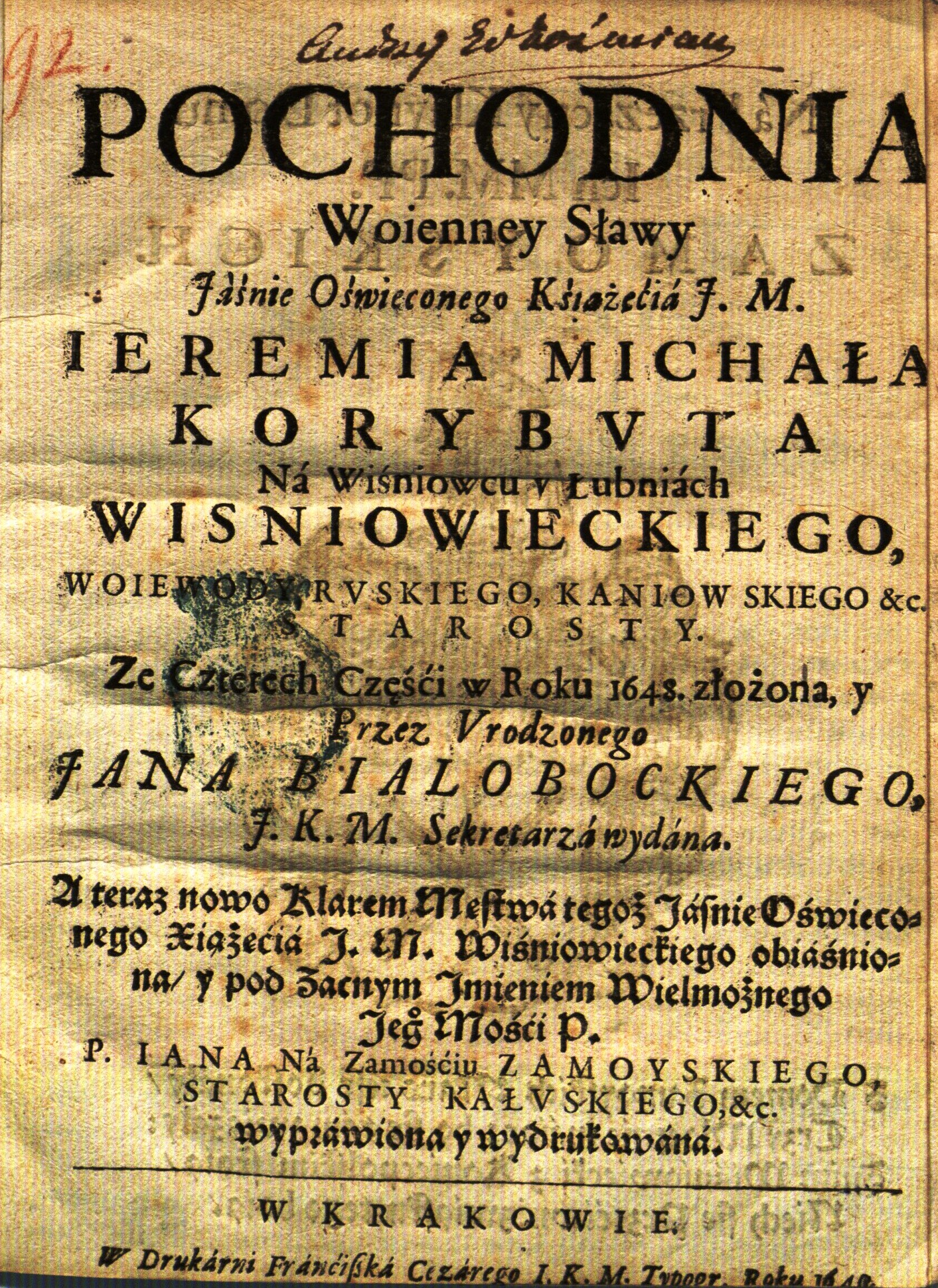 "Pochodnia woienney sławy [...] Ieremia Michała Korybvta na Wiśniowcu y Łubniach Wisniowieckiego, woiewody rvskiego [...]" Jana Białobockiego., [online] Warszawa: Narodowy Instytut Audiowizualny [dostęp 27.02.2026]. Dostępny w internecie: http://www.ipsb.nina.gov.pl/a/foto/pochodnia-woienney-slawy-ieremia-michala-korybvta-na-wisniowcu-y-lubniach-wisniowieckiego-woiewody-rvskiego-jana-bialobockiego