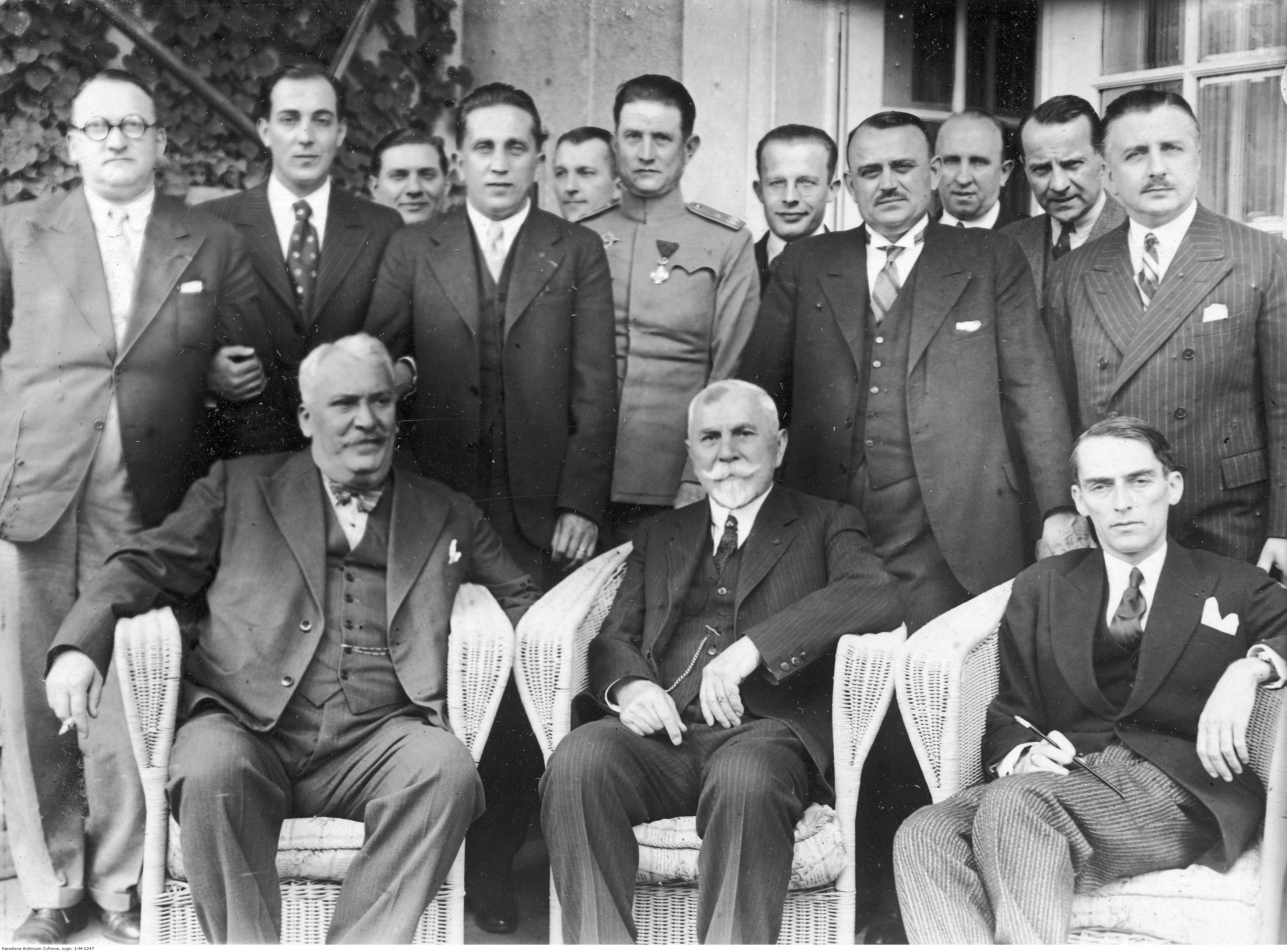 Fotografia grupowa uczestników spotkania. Siedzą od lewej: prezes Aeroputu Novaković, wiceprezes Aeroklubu Jugosłowiańskiego Vlajić, Sondenmajer. Stoją: ppłk Bogdan Kwieciński (1. z lewej), sekretarz Aeroklubu Jugosłowiańskiego Marković, pilot mjr Wacław Makowski (I rząd 3. z lewej), dowódca pułku lotniczego Tomić, attache Poselstwa RP w Belgradzie Wacław Knoll (4. z prawej), attache prasowy Poselstwa RP w Belgradzie Ksawery Glinka (3. z prawej), attache wojskowy Poselstwa RP w Belgradzie mjr Jan Grudzień (2. z prawej), poseł nadzwyczajny i minister pełnomocny Polski w Belgradzie Władysław Schwarzburg-Gunther (1. z prawej).