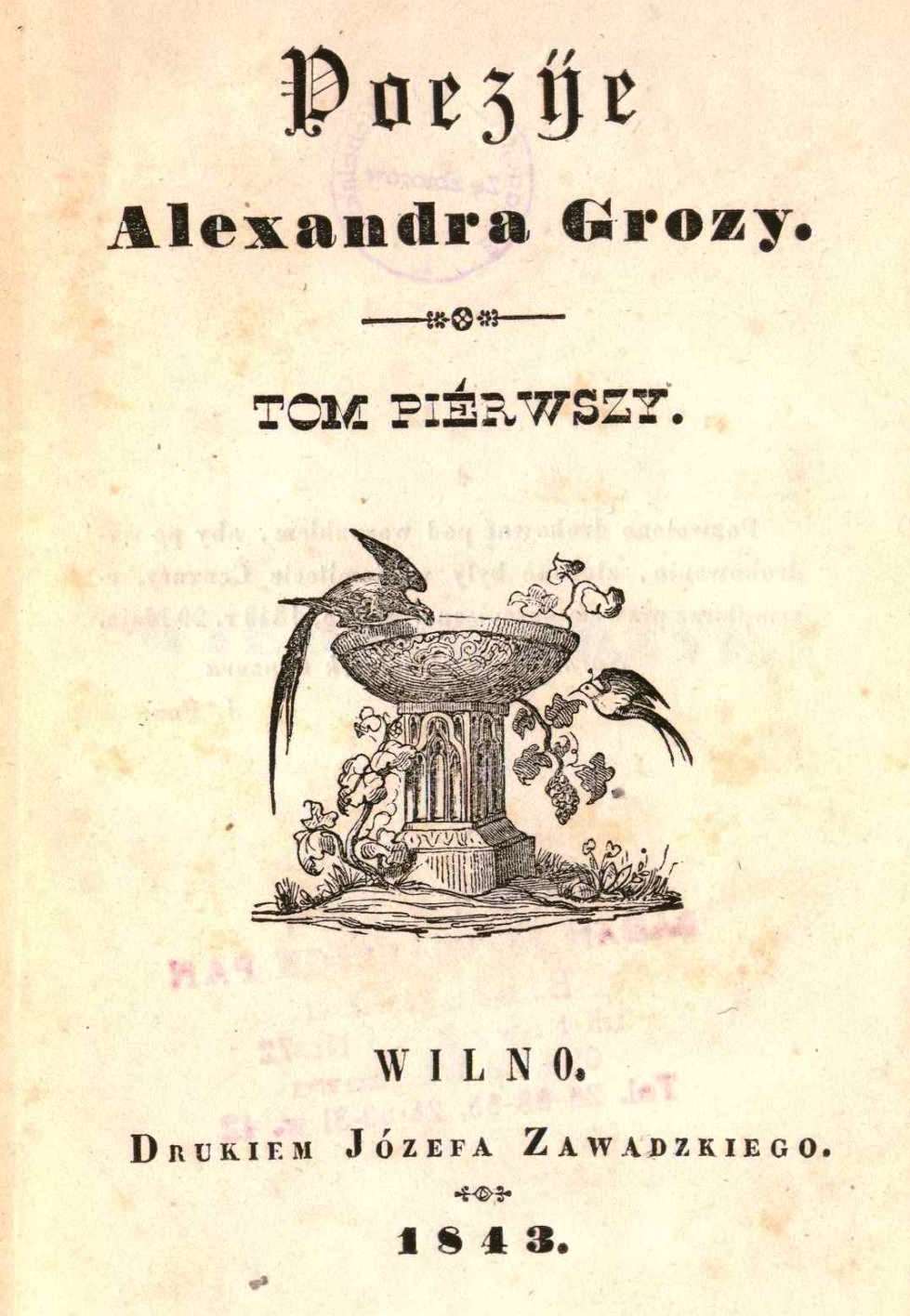 "Poezye Alexandra Grozy. T. 1.", [online] Warszawa: Narodowy Instytut Audiowizualny [dostęp 13.04.2026]. Dostępny w internecie: http://www.ipsb.nina.gov.pl/a/foto/poezye-alexandra-grozy-t-1-wiersze-rozne