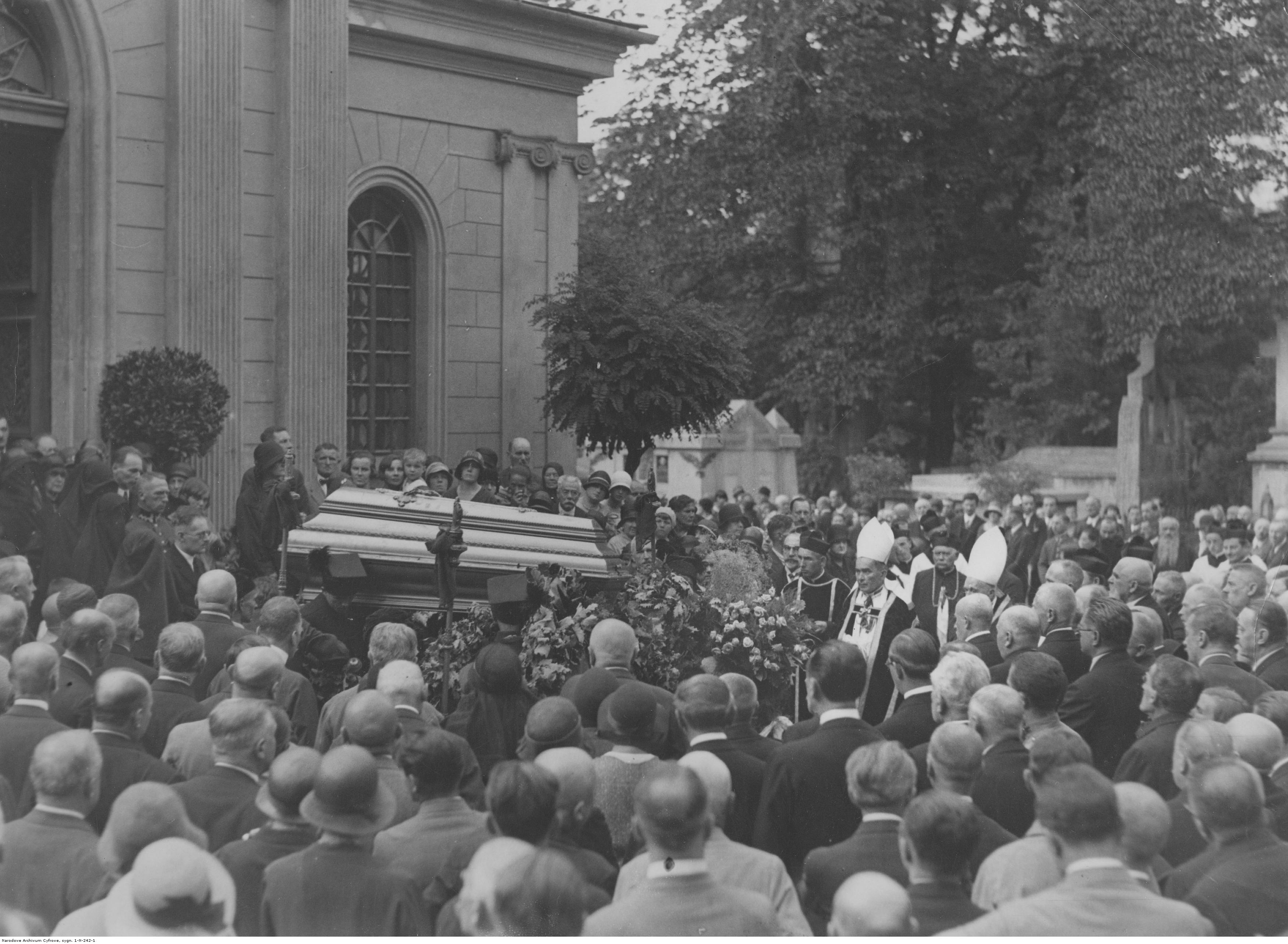 Wynoszenie trumny ze zwłokami Władysława Leopolda Jaworskiego z kaplicy cmentarnej.