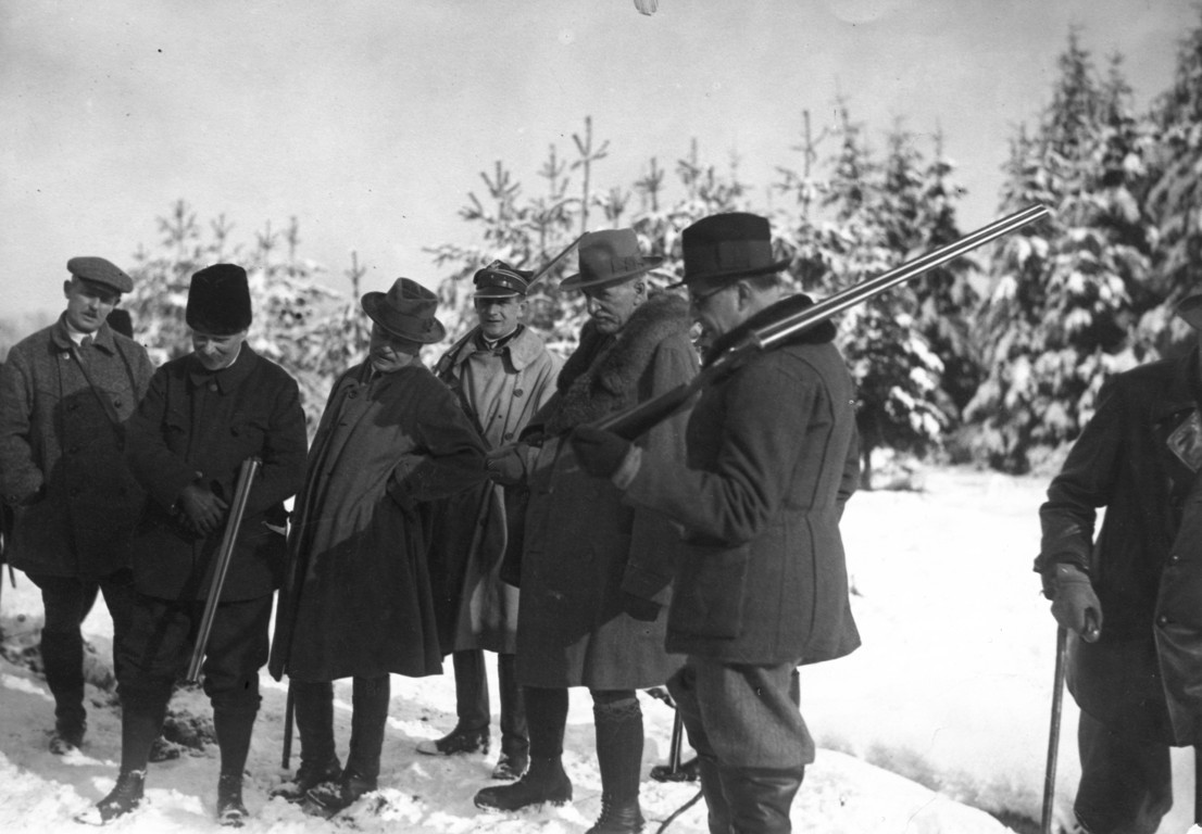 Uczestnicy polowania przed rozejściem się na poszczególne pozycje. Widoczni m.in.: minister komunikacji Paweł Romocki (1. z lewej), minister rolnictwa Karol Niezabytowski (2. z lewej), mjr Andrzej Meyer (4. z lewej) i prezydent RP Ignacy Mościcki (5. z lewej).