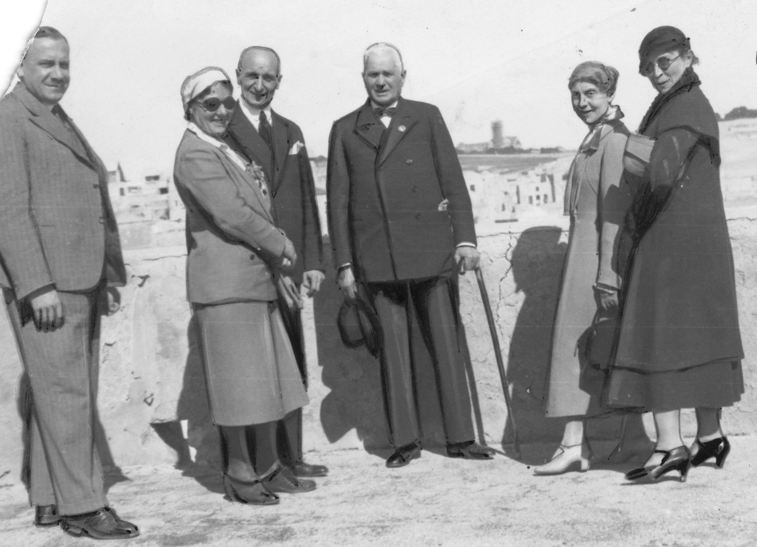 Uczestnicy pielgrzymki na tarasie Domu Polskiego. Widoczni od lewej m.in.: dyrektor oddziału Banku Polska Kasa Opieki SA w Tel Awiwie Tadeusz Piech (1.), pisarka Zofia Kossak - Szczucka (2.), konsul generalny RP w Jerozolimie Zdzisław Kurnikowski (3.).