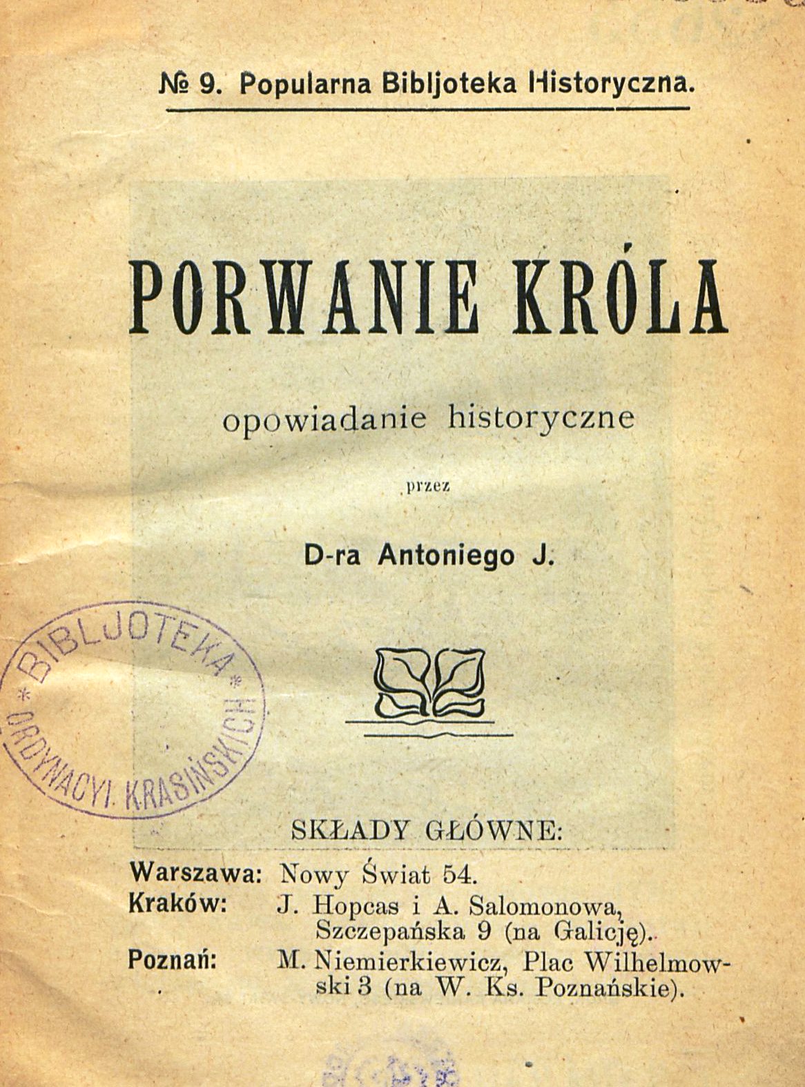"Porwanie króla : opowiadanie historyczne" Antoniego Józefa Rolle., [online] Warszawa: Narodowy Instytut Audiowizualny [dostęp 15.04.2026]. Dostępny w internecie: http://www.ipsb.nina.gov.pl/a/foto/porwanie-krola-opowiadanie-historyczne-antoniego-jozefa-rolle