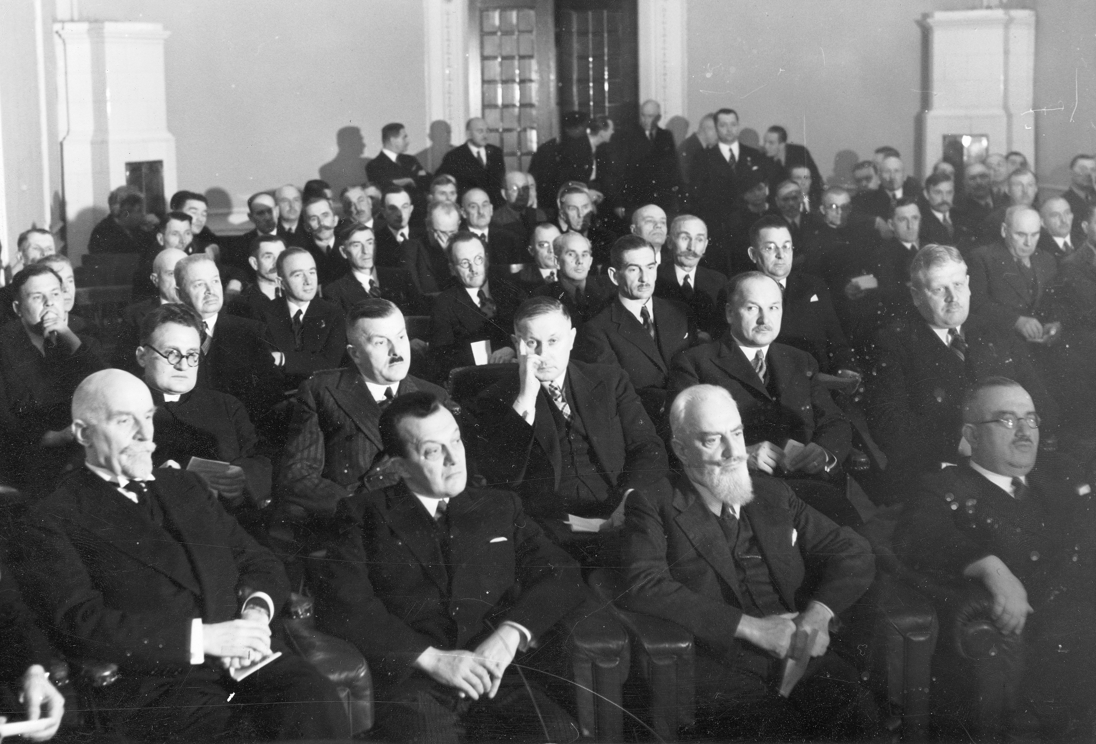 Uczestnicy posiedzenia. W pierwszym rzędzie siedzą od lewej: Władysław Sołtan, prokurator Sądu Apelacyjnego w Warszawie Mieczysław Wójcicki, prezes Sądu Okręgowego w Warszawie Tadeusz Kamieński, wojewoda warszawski Bronisław Nakoniecznikow-Klukowski.