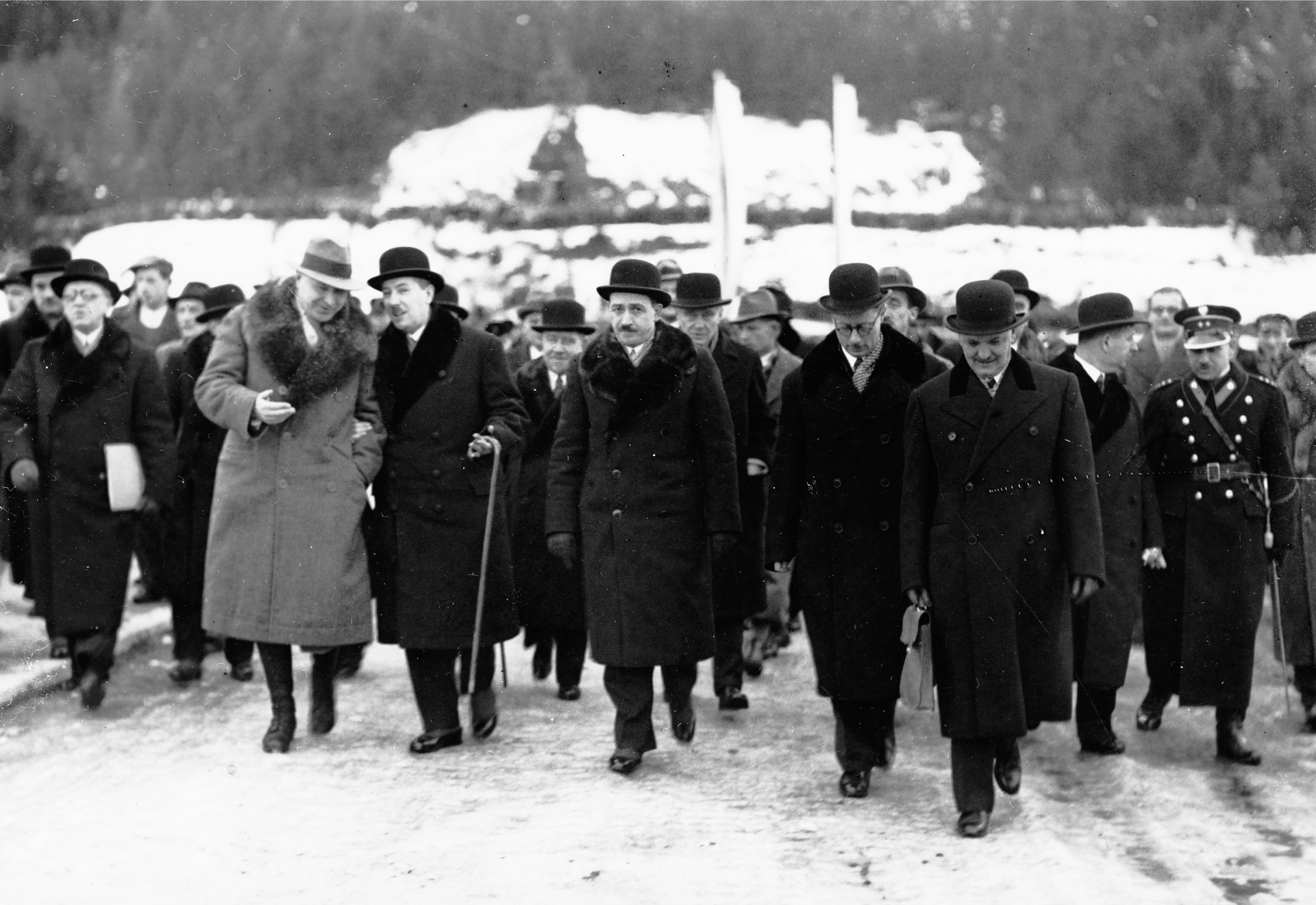 Uczestnicy uroczystości. Widoczni m.in.: wicepremier i minister skarbu Eugeniusz Kwiatkowski (4. z prawej w pierwszym rzędzie), marszałek sejmu Stanisław Car (w jasnym płaszczu), wiceminister komunikacji Julian Piasecki (na prawo od wicepremiera), wojewoda krakowski Mikołaj Kwaśniewski (na prawo za J. Piaseckim), prezes NIK Jakub Marian Krzemieński (na lewo za J. Piaseckim).