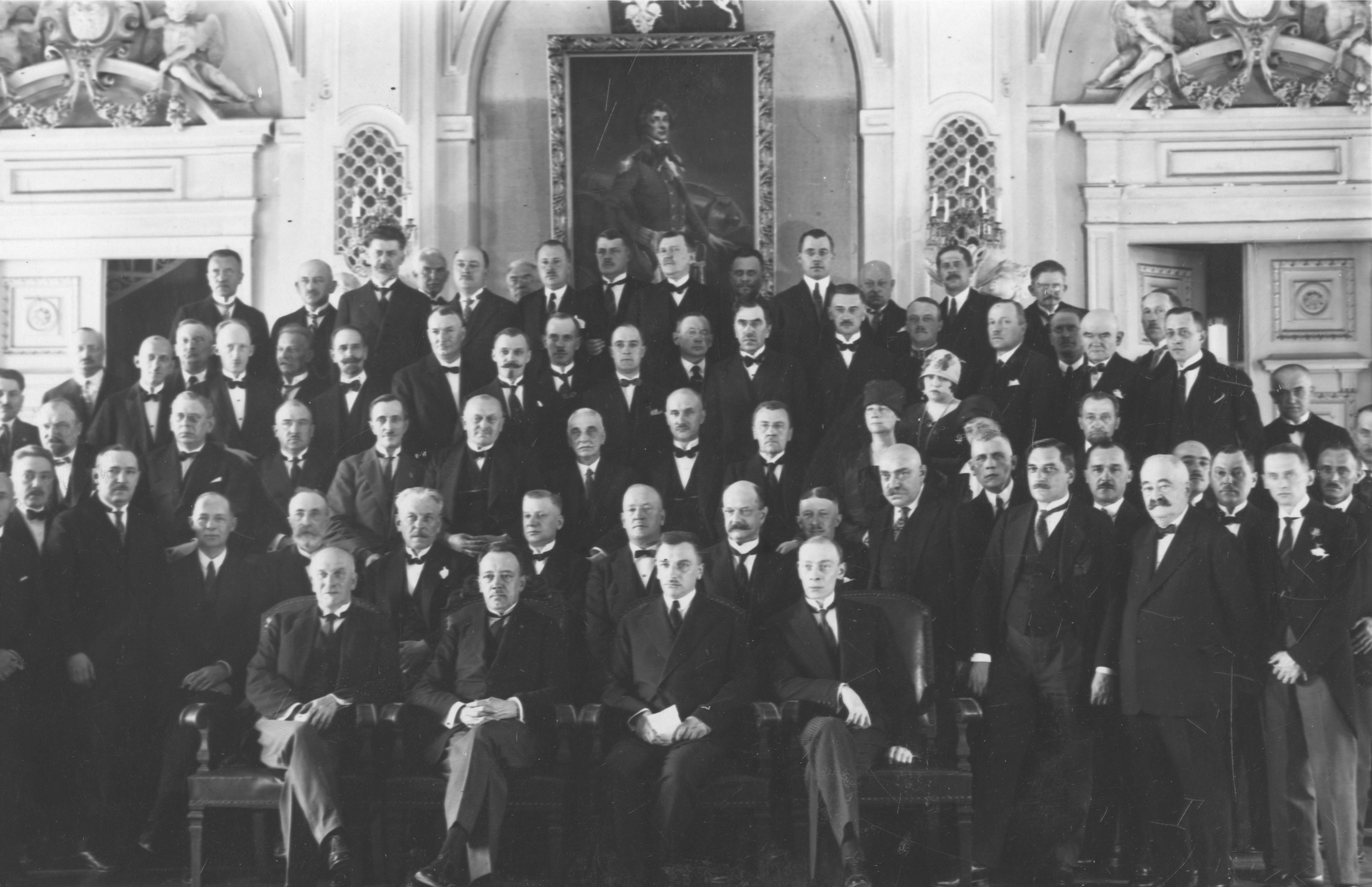 Nowy prezydent m.st. Warszawy Zygmunt Słomiński w otoczeniu witających go wyższych urzędników Magistratu. Widoczni w pierwszym rzędzie od lewej: wiceprezydent m.st. Warszawy Wincenty Bogucki, prezydent m.st. Warszawy Zygmunt Słomiński, wiceprezydent m.st. Warszawy Tadeusz Szpotański, wiceprezydent m.st. Warszawy Marian Borzęcki.