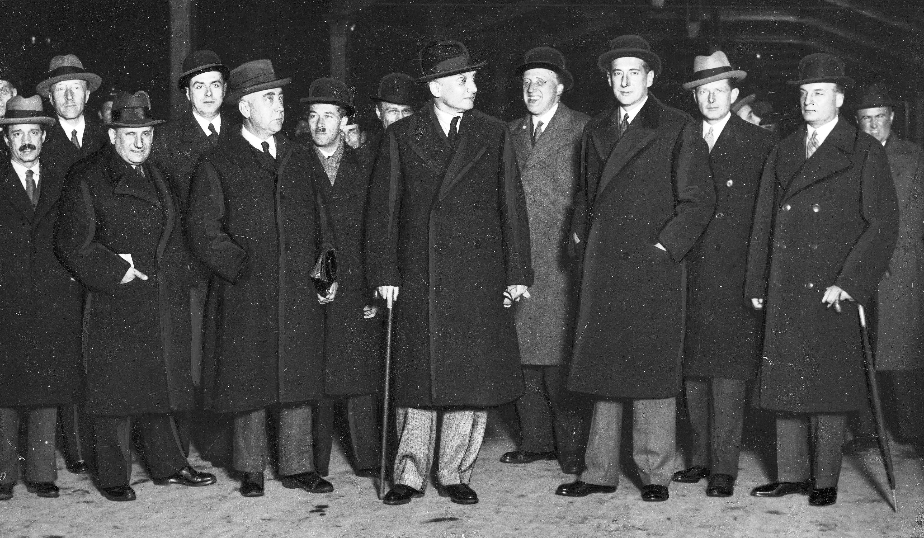 Powitanie ministra spraw zagranicznych Augusta Zaleskiego na dworcu kolejowym. Widoczni m.in.: tłumacz i dziennikarz Lucien Roquigny (1. z lewej), pułkownik Ścierzyński (3. z lewej), radca MSZ Marian Szumlakowski (6. z lewej), minister spraw zagranicznych August Zaleski (7. z lewej, z laską), wiceminister spraw zagranicznych Józef Beck (9. z lewej), naczelnik Wydziału Organizacji Ustrojów Międzynarodowych Edward Raczyński (9. z lewej), dyrektor protokołu dyplomatycznego MSZ Karol Romer (10 z lewej).