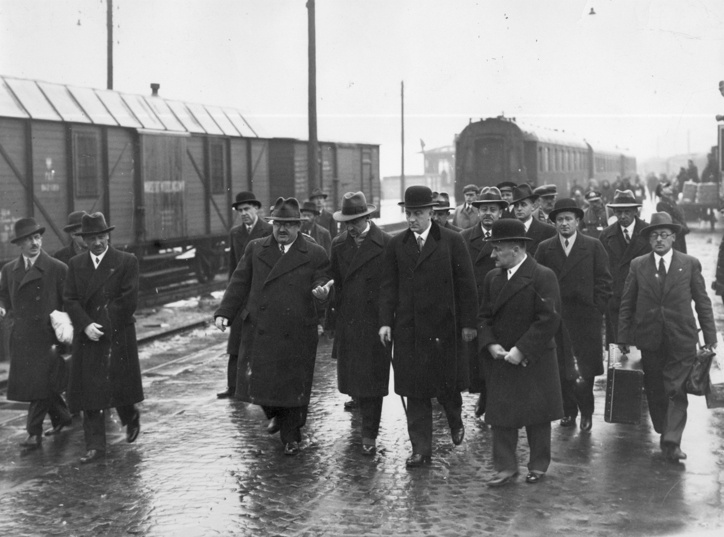 Minister rolnictwa i reform rolnych Bronisław Nakoniecznikow-Klukowski (1 z lewej, w 1 rzędzie) w towarzystwie witających go osób opuszcza Dworzec Główny w Warszawie. Obok widoczni m.in.: wiceminister rolnictwa Wacław Karwacki (opiera się na lasce), poseł RP w Budapeszcie Stanisław Łepkowski.