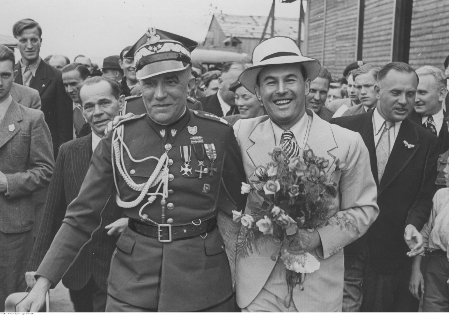 Prezes Zarządu Głównego Ligii Obrony Powietrznej i Przeciwgazowej Leon Berbecki w towarzystwie Jana Kiepury podczas uroczystości przekazywania trzech samolotów, ufundowanych przez Cech Piekarzy Chrześcijan województwa warszawskiego, na Polu Mokotowskim. Z prawej widoczny także prezes Cechu Piekarzy Magiera.
