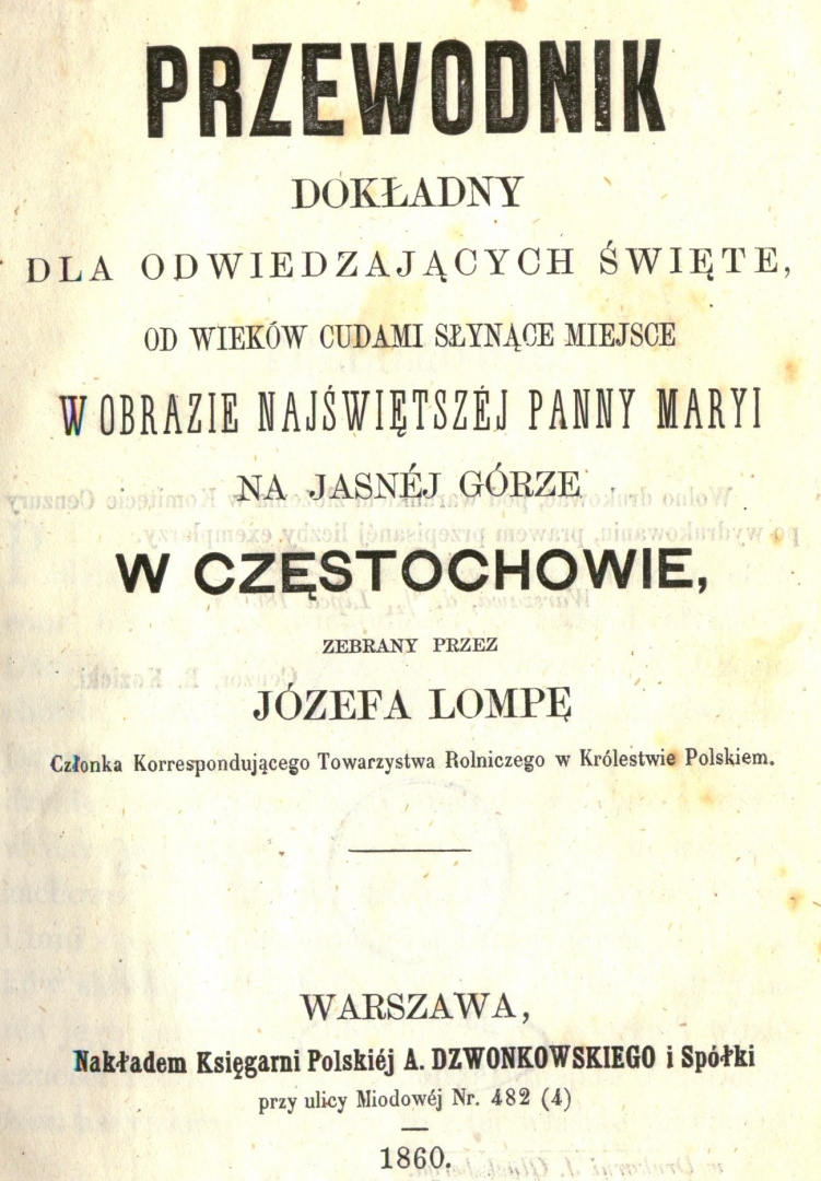 , "Przewodnik dokładny dla odwiedzających święte, od wieków cudami słynące miejsce w obrazie Najświętszej Panny Maryi na Jasnej Górze w Częstochowie" Józefa Lompy., [w:] Polski słownik biograficzny, t. ,