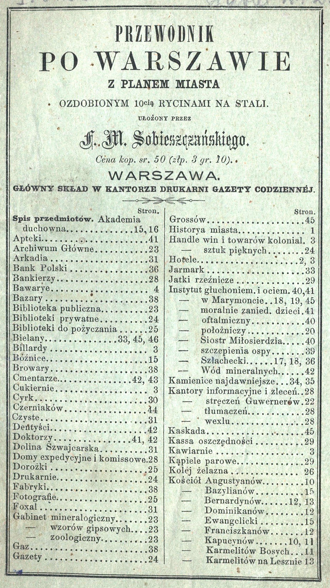 , "Przewodnik po Warszawie: z planem miasta ozdobionym 10cią rycinami na stali" Franciszka Maksymiliana Sobieszczańskiego., [w:] Polski słownik biograficzny, t. ,